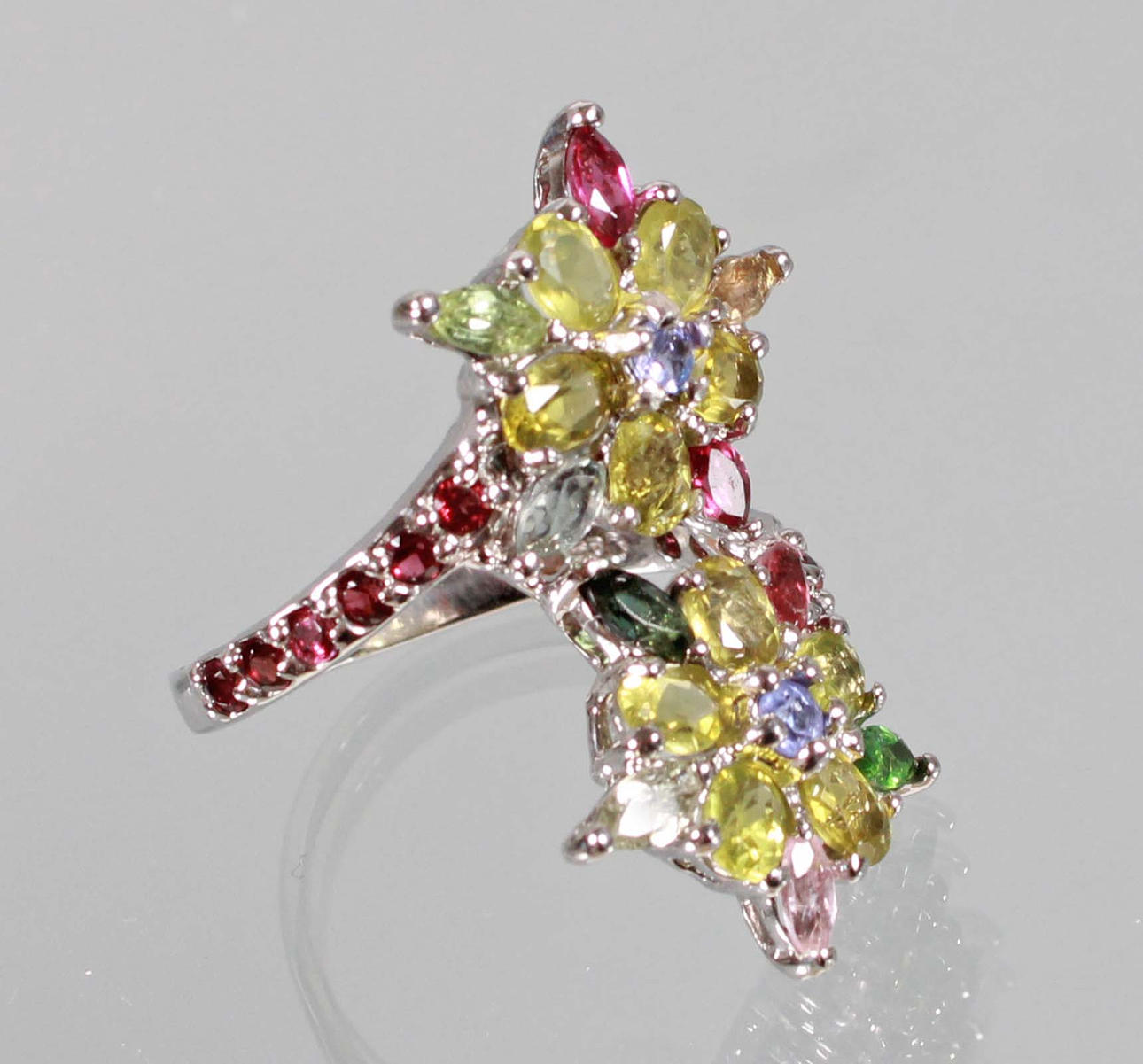 Ringen är högpolerad, rhodiumpläterad och stämplerad i 925 silver, ringhuvudet är stickat i blomform och infattat med fasetterade ädelstenar (peridot, turmalin, tanzanit och rhodolit) ringstorlek 54, ringhuvud 28 x 15 mm, vikt 4.9 gram.