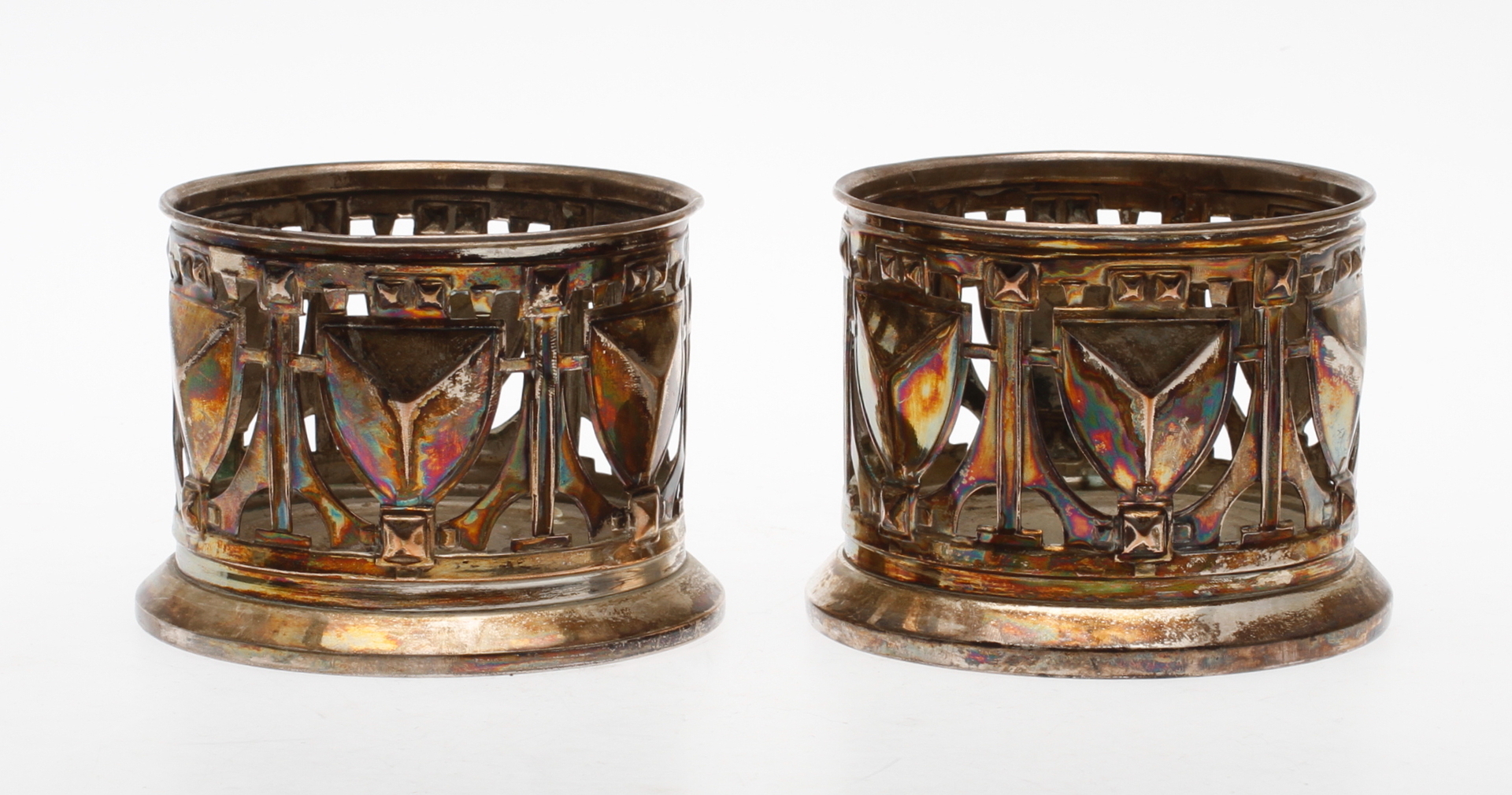 41674. FLASKCOASTER, ett par, nysilver, jugend.