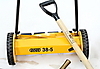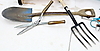 Handklippare Ginge 38-5, grep "Karlstads redskap", spade "PH", Häcksax "Freunde 512", gödselspridare "Gardena", kombisystem "Gardena 130" med räfsa, kratta, mossrivare och luckrare, säckhållare.