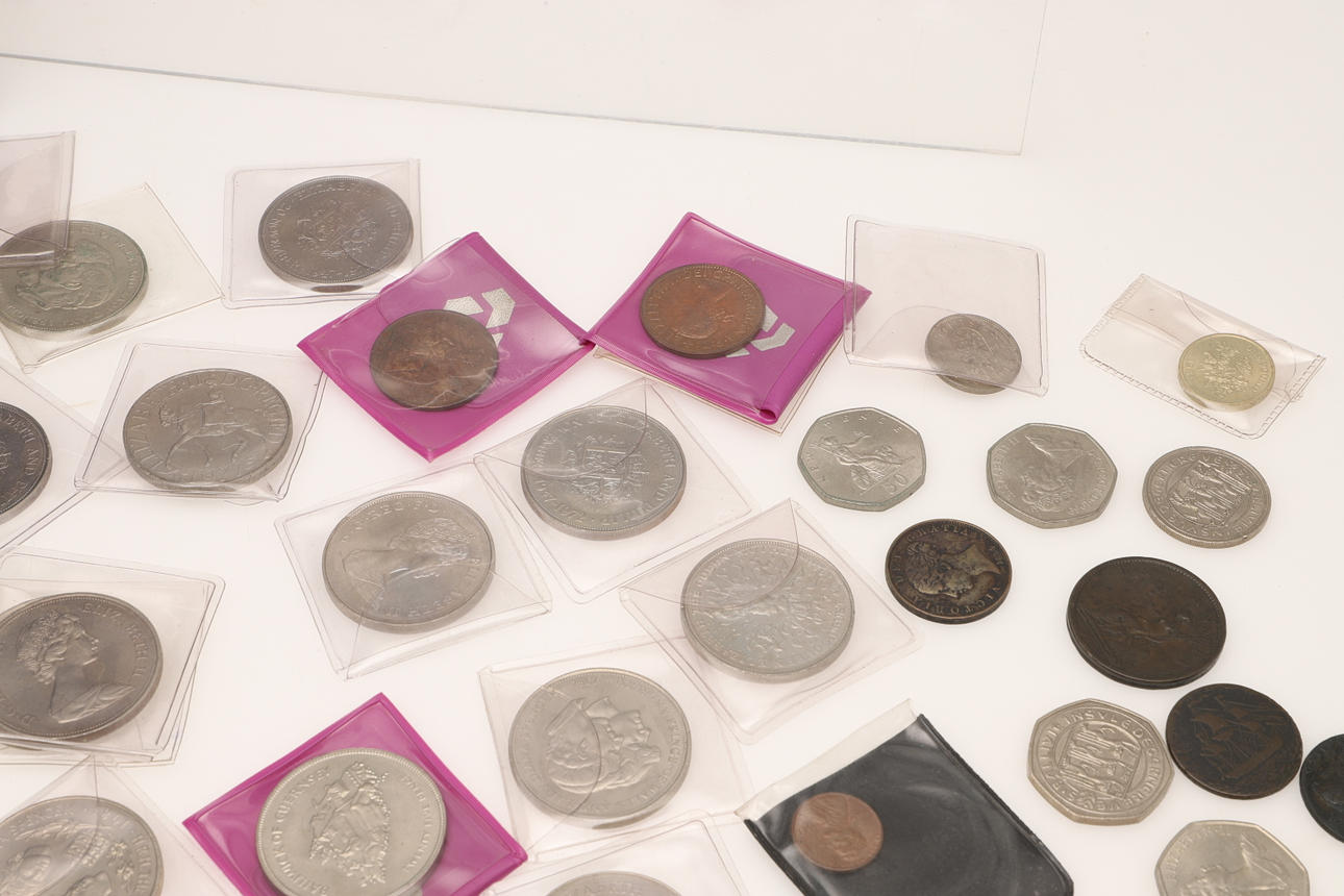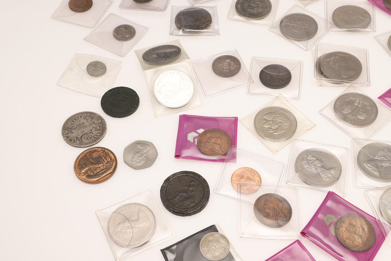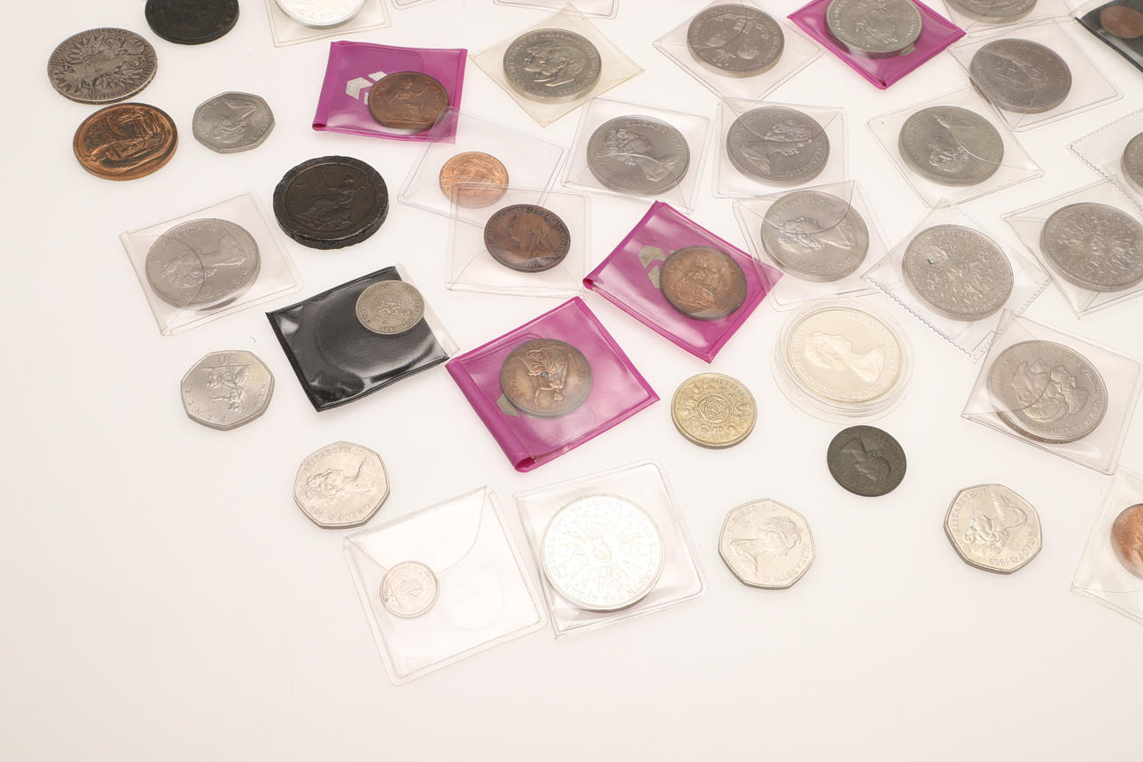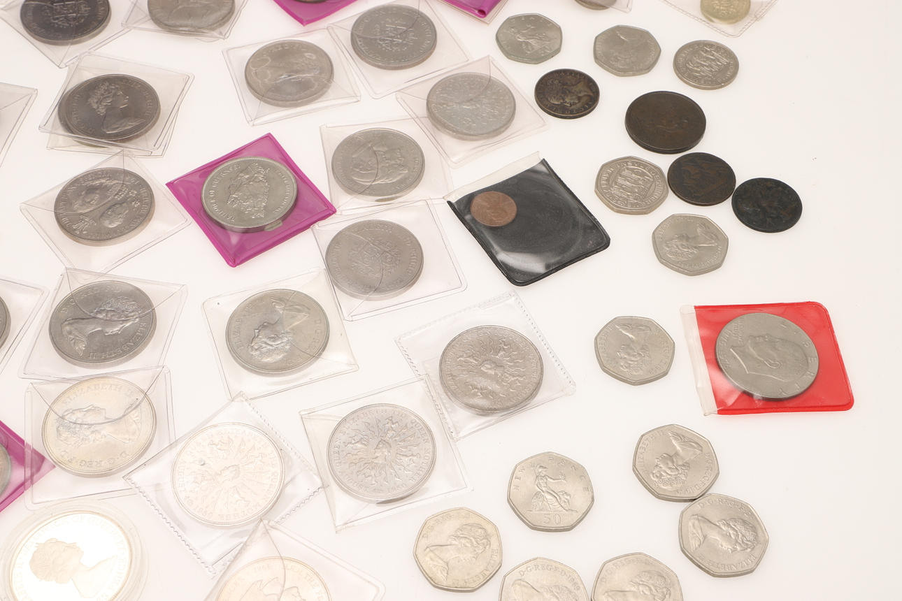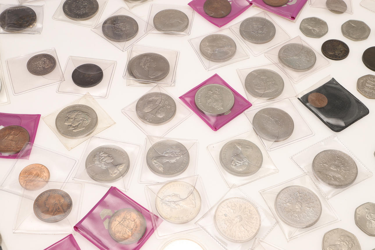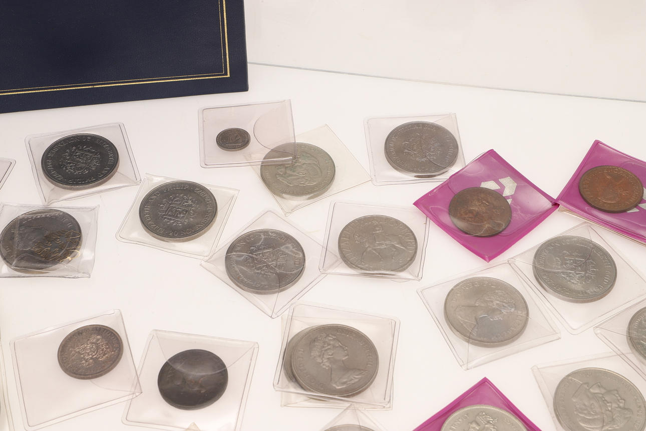 En samling varierade souvenirkronor, fitty pence-bitar, Cartwheel-utgåvor, ett myntalbum och andra.