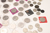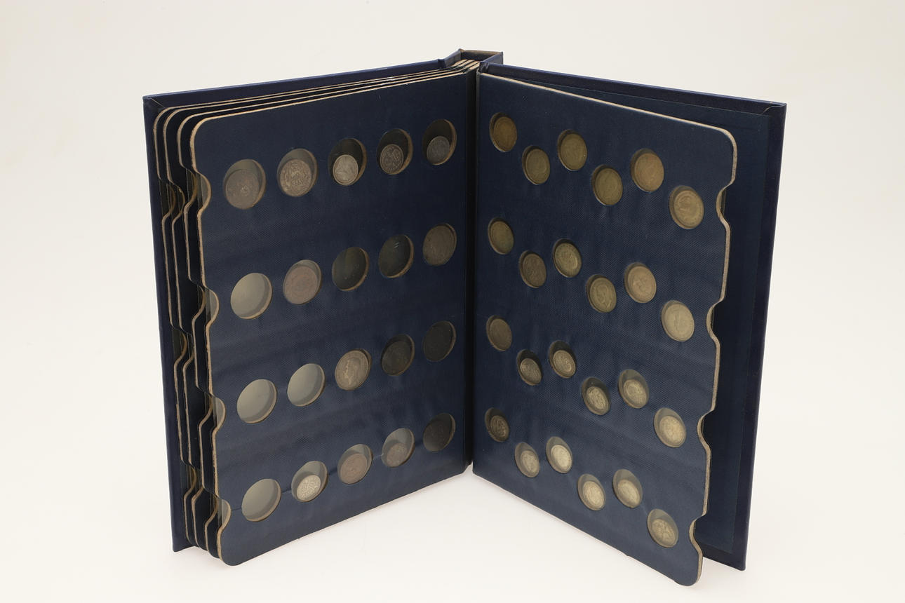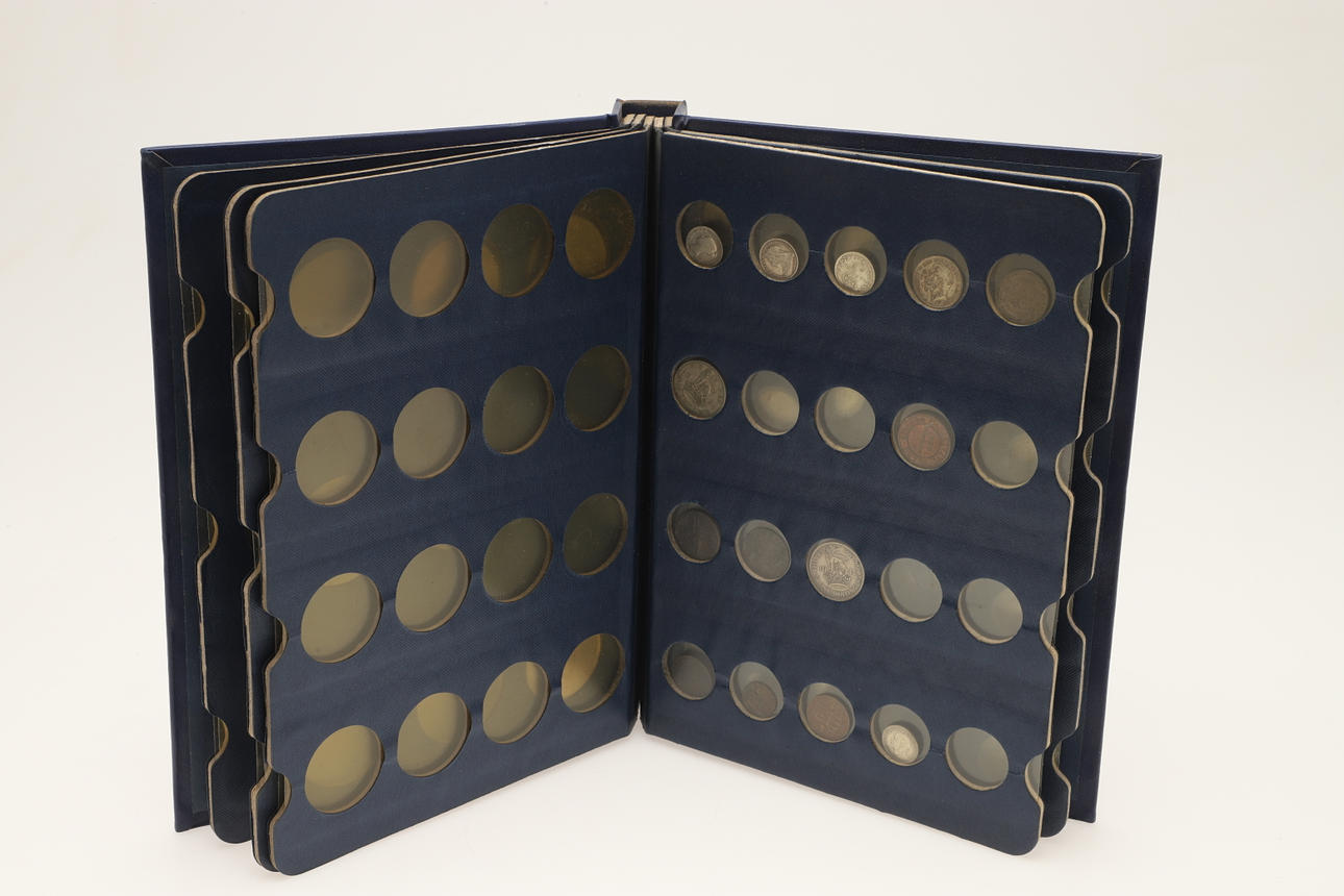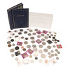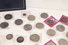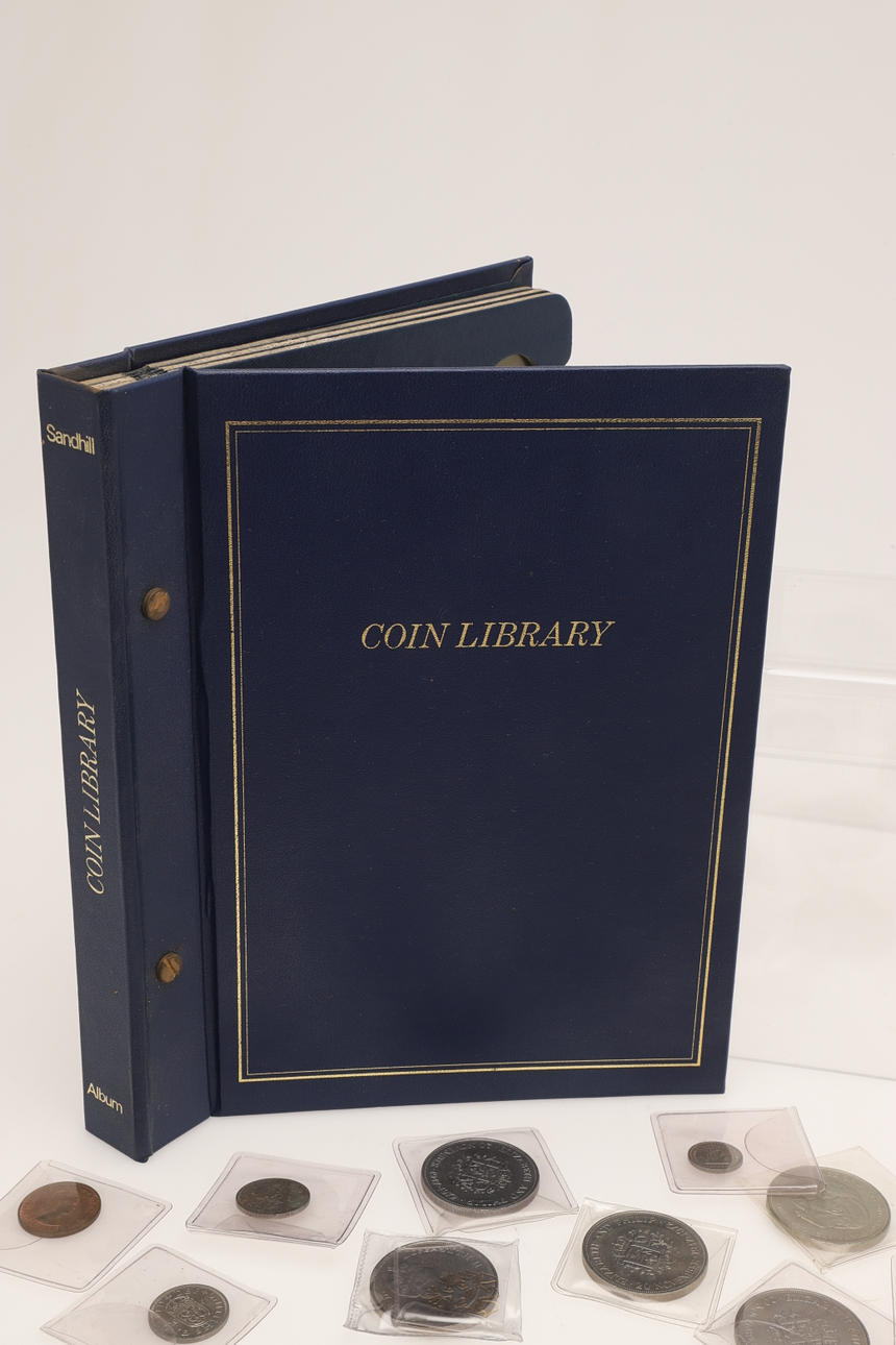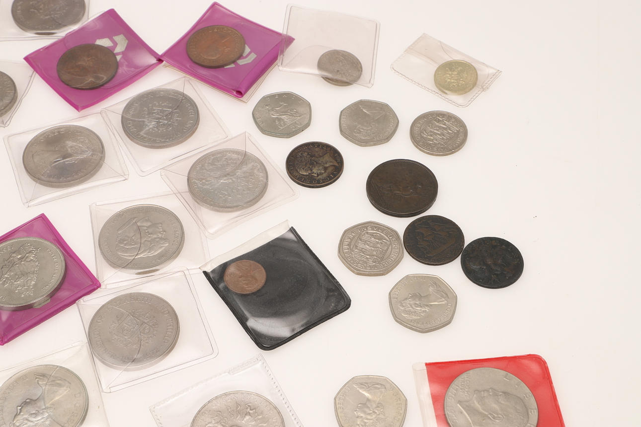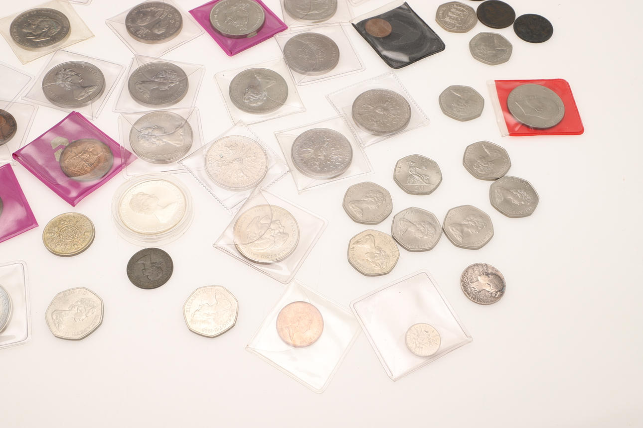 En samling varierade souvenirkronor, fitty pence-bitar, Cartwheel-utgåvor, ett myntalbum och andra.