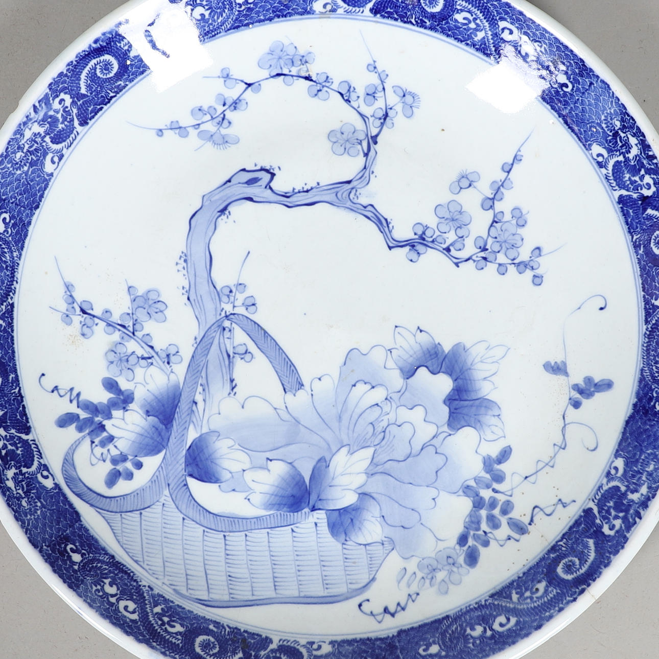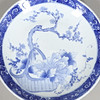 Meiji-perioden, den blå och vita laddaren målad med ett blommande träd, blommor och löv, och med drakar i en kant runt kanten. 40 cm diameter.