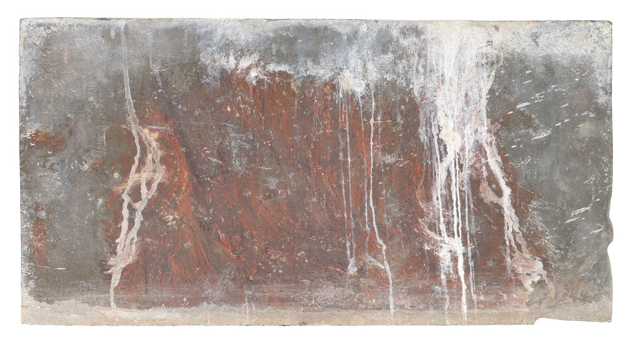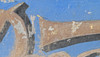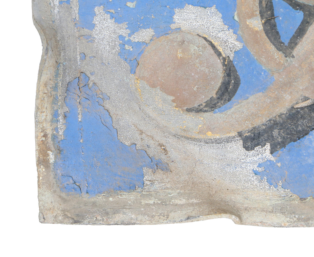 Mycket vittrad, färgförlust och slag genomgående, böjd i områden främst till nedre vänstra hörnet.