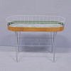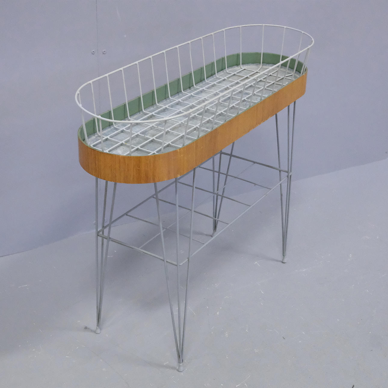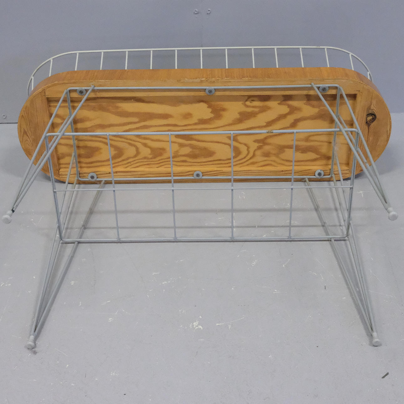 Två plan. Ställning och korg av grålackerad metall. Sarg med teak-fanér. Övre hyllplan av trä och plåtskiva. Höjd 65cm, bredd 80cm, djup 26cm.