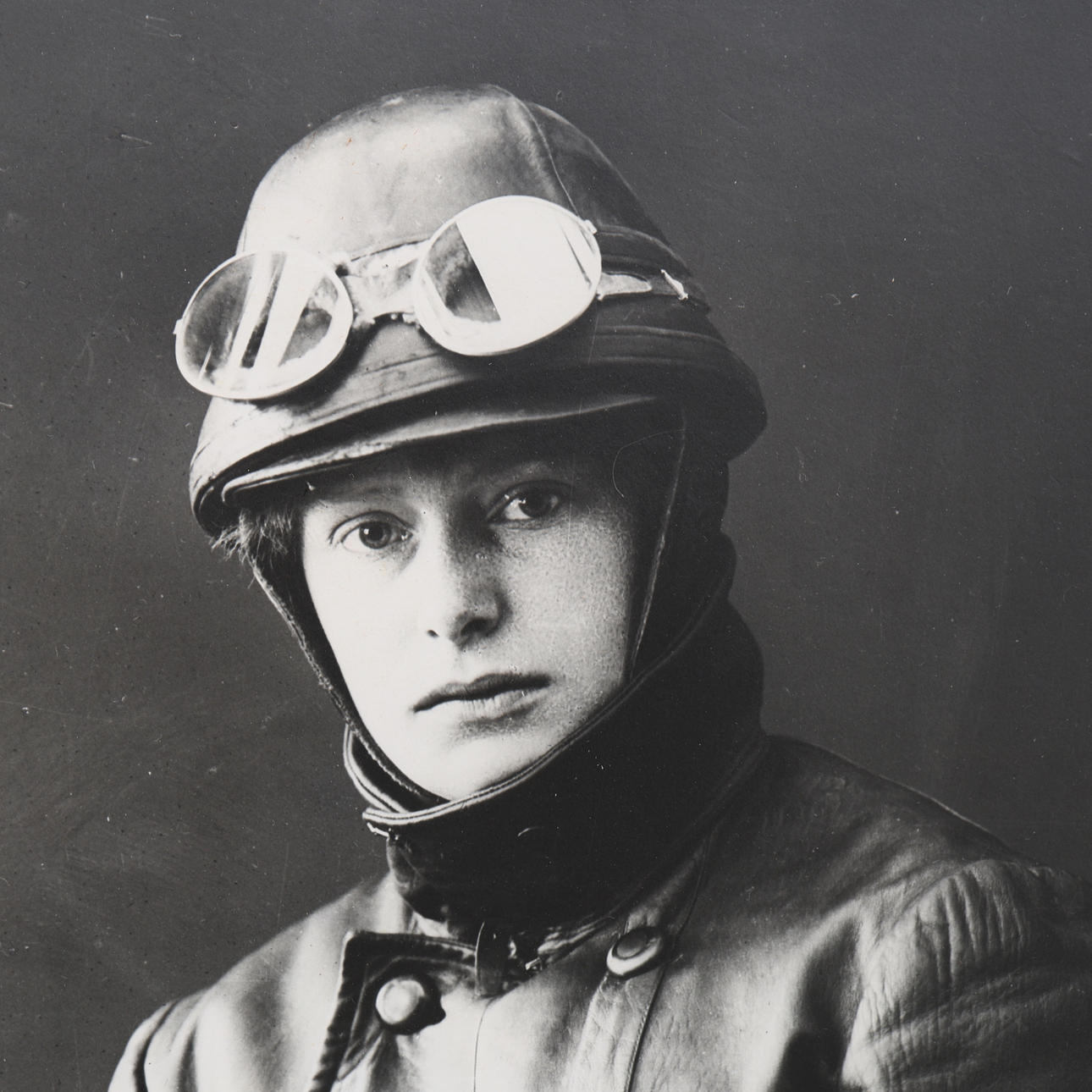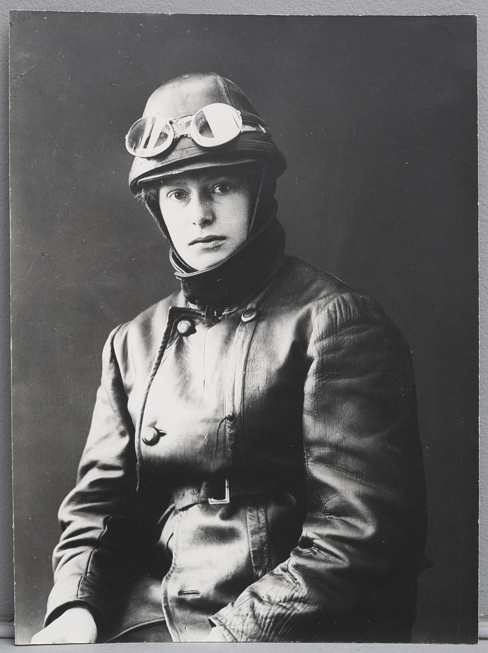 Kopian framtagen av Karl-Erik Olsson direkt efter glasplåten i samband med arbetet med film "Så vit som en snö" Bilden av Elsa Andersson 1897-1922 togs efter att hon avlagt flygcertifikat vid Thulins flygskola 1920.