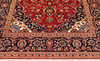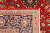 Huvudfält med röd bottenfärg, mittmedaljong samt hörnornament. Huvudfält med mörk bottenfärg. Mattan har dekor av palmett och arabeskranka.
