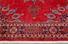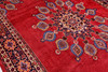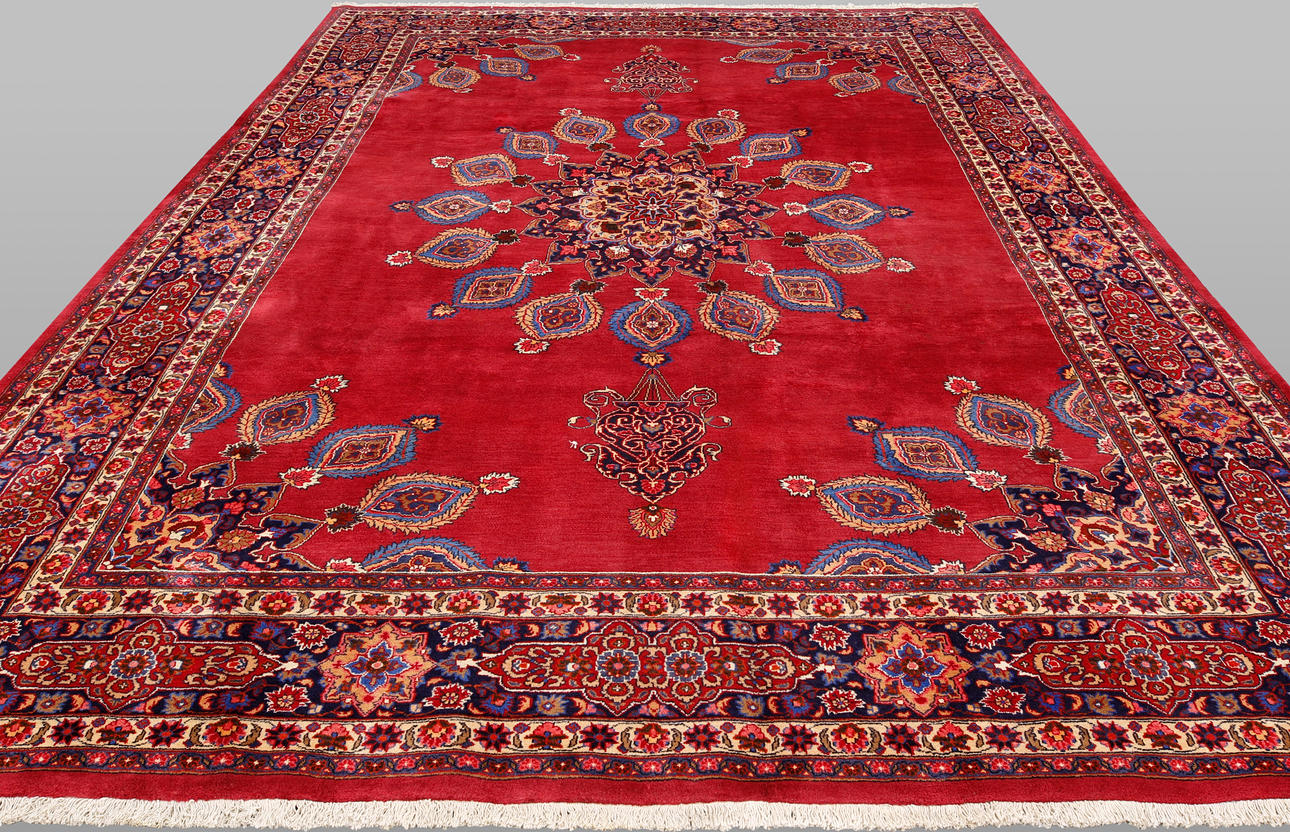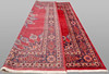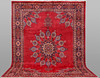 Röd bottenfärg med mittmedaljong samt hörnornament. Dekor av stiliserad växtlighet.