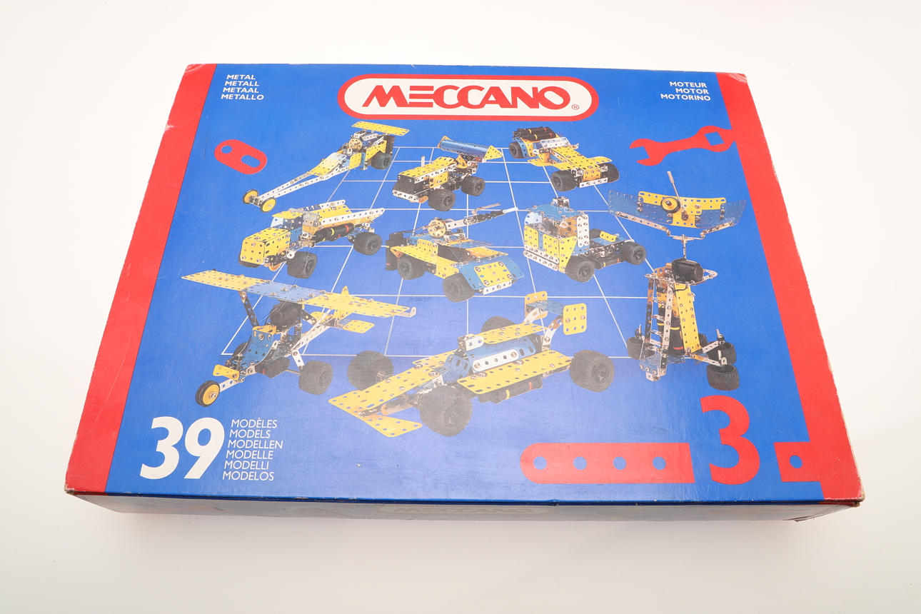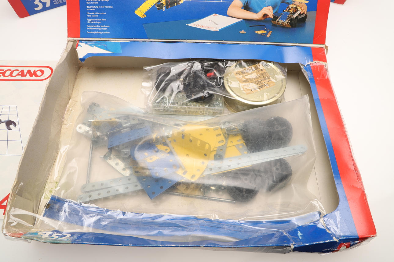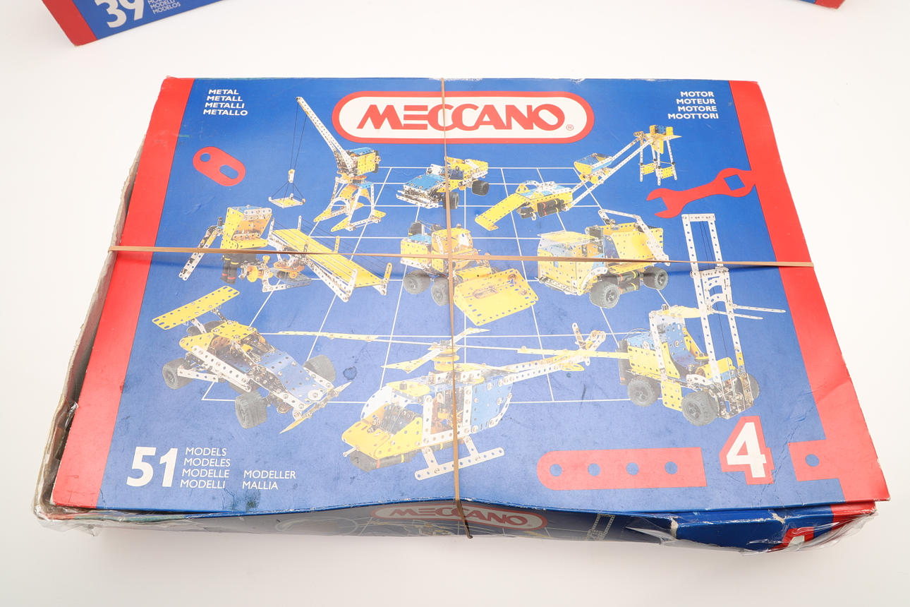 för att inkludera Meccano No. 2 konstruktörsuppsättningar med 27 modeller, Meccano nr. 3 konstruktörsuppsättningar med 39 modeller, och en Meccano No. 4 konstruktörsuppsättningar med 51 modeller, alla i originallådor (antal).