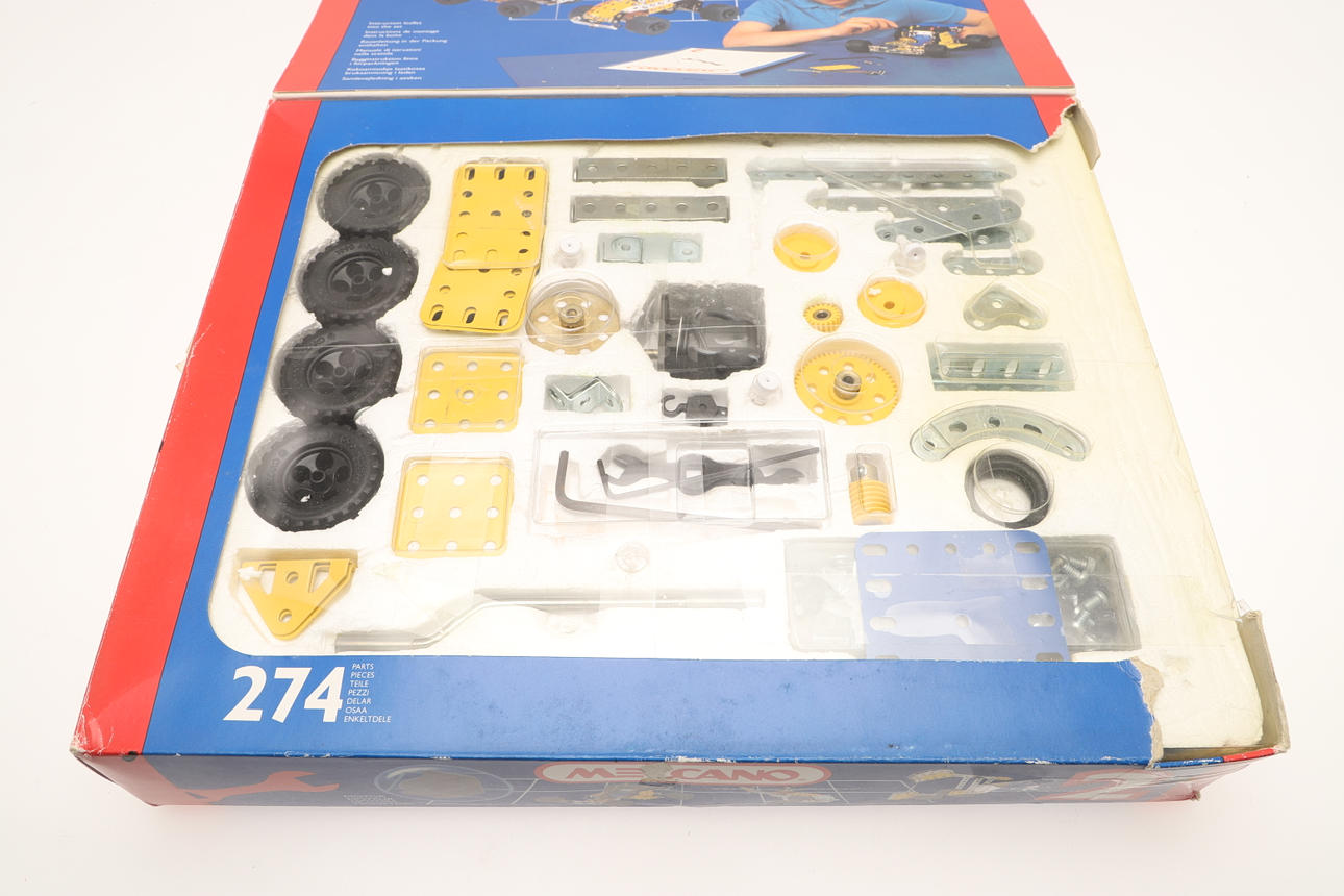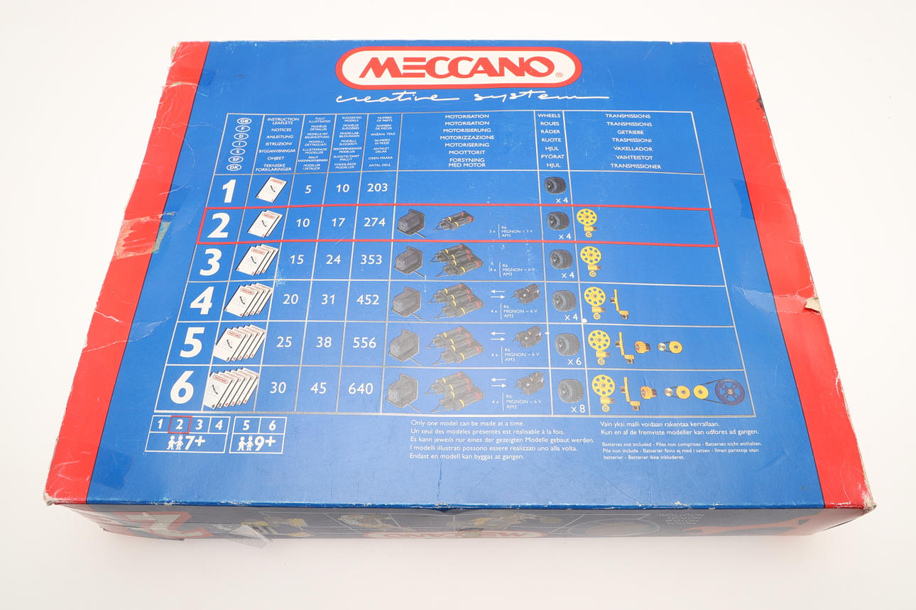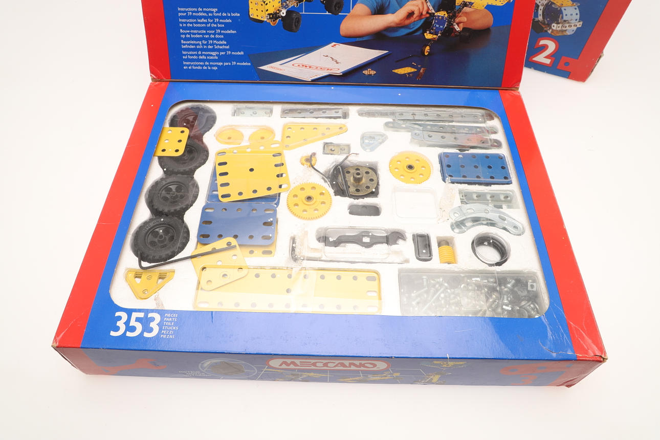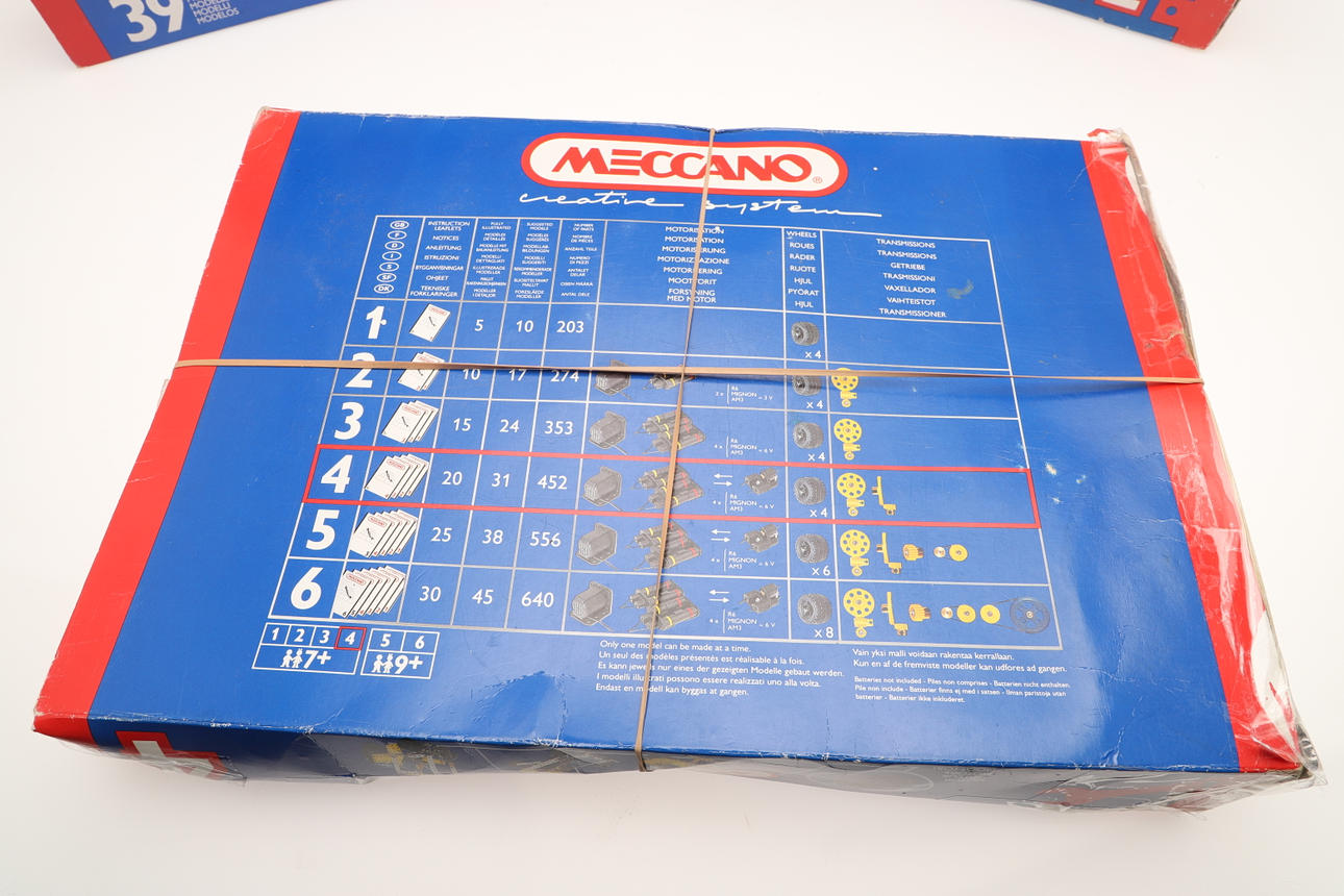 för att inkludera Meccano No. 2 konstruktörsuppsättningar med 27 modeller, Meccano nr. 3 konstruktörsuppsättningar med 39 modeller, och en Meccano No. 4 konstruktörsuppsättningar med 51 modeller, alla i originallådor (antal).