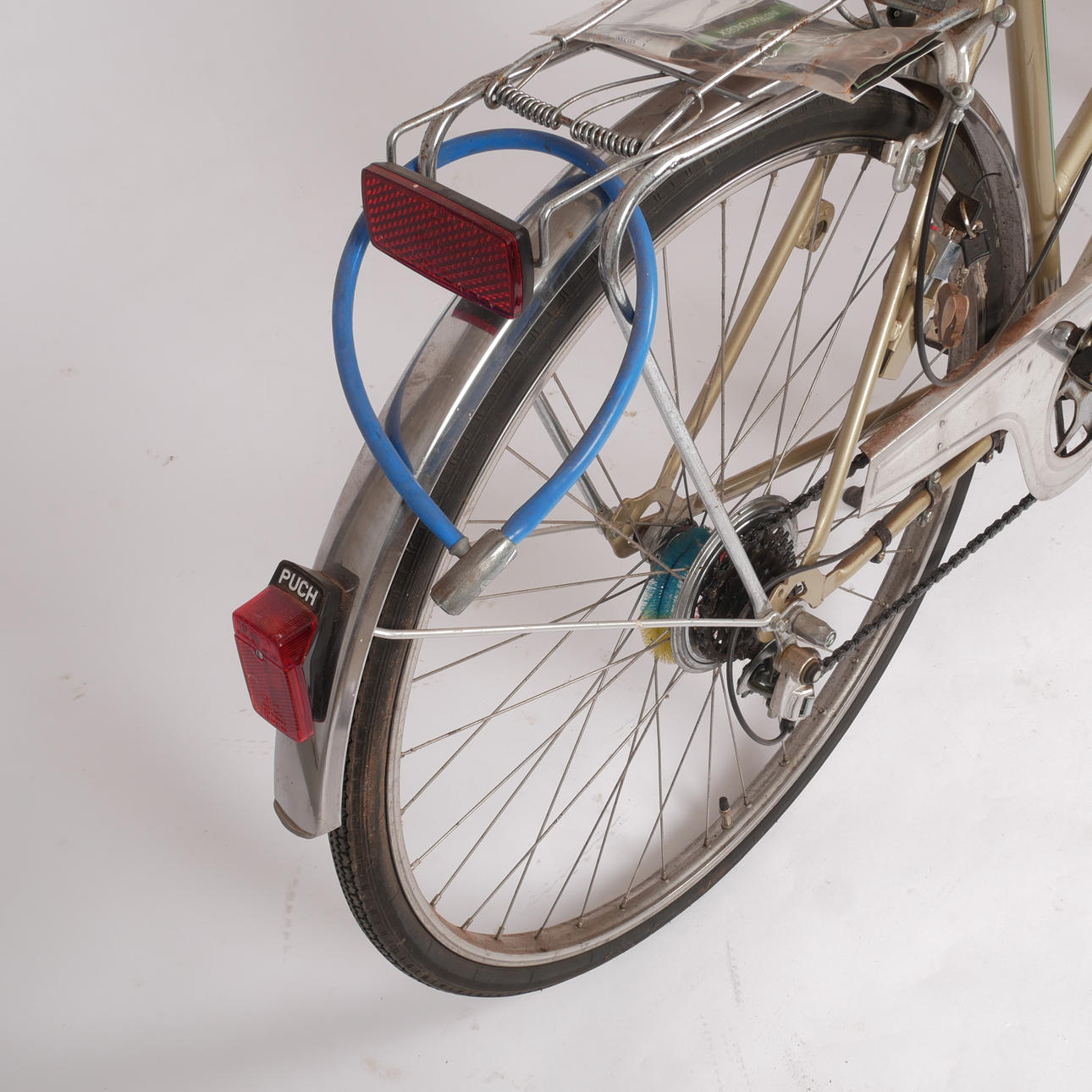 Bruksslitage. Rost, fläckig sadel. Bakdäck utan luft. Ej funktionstestad.