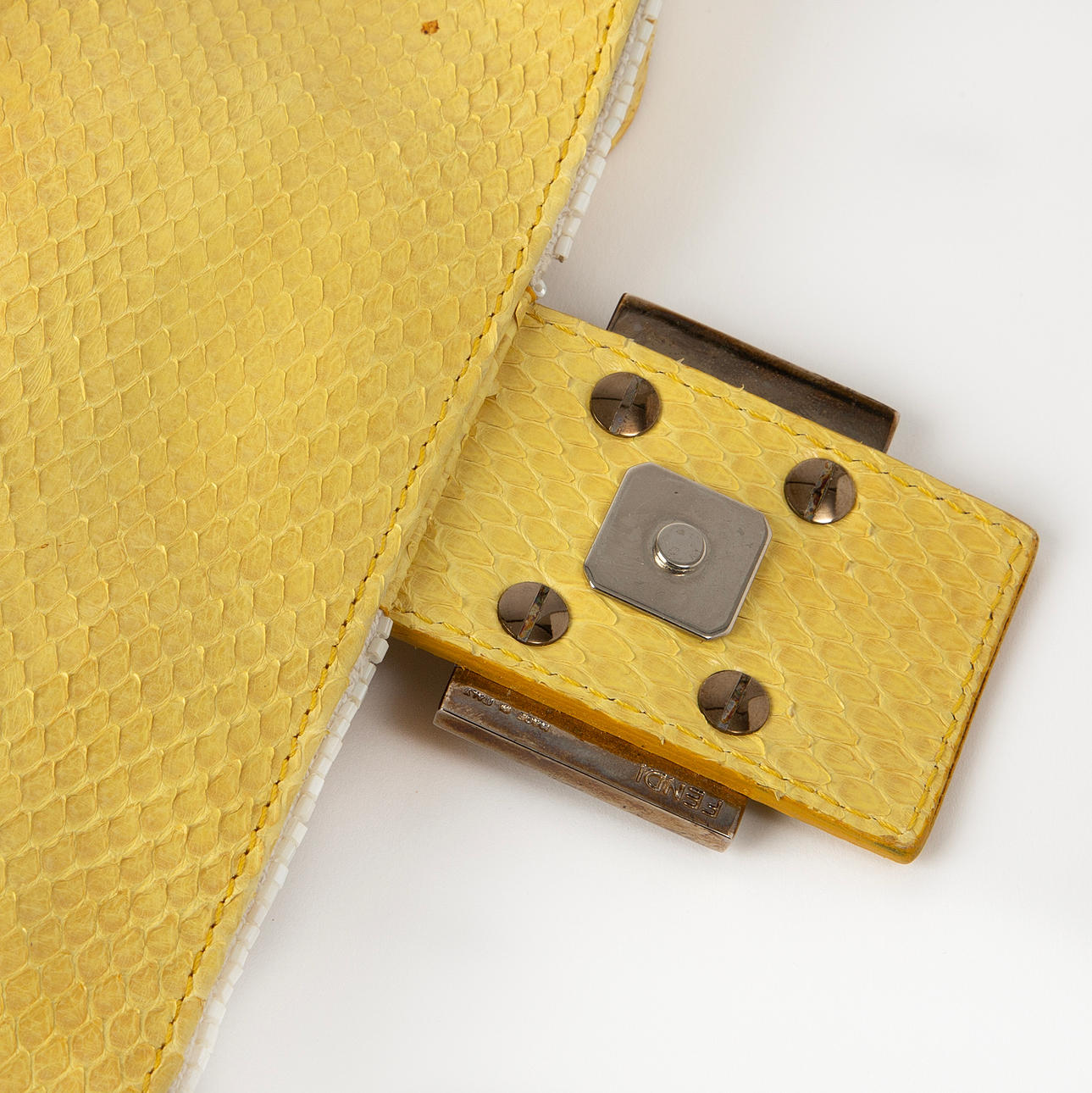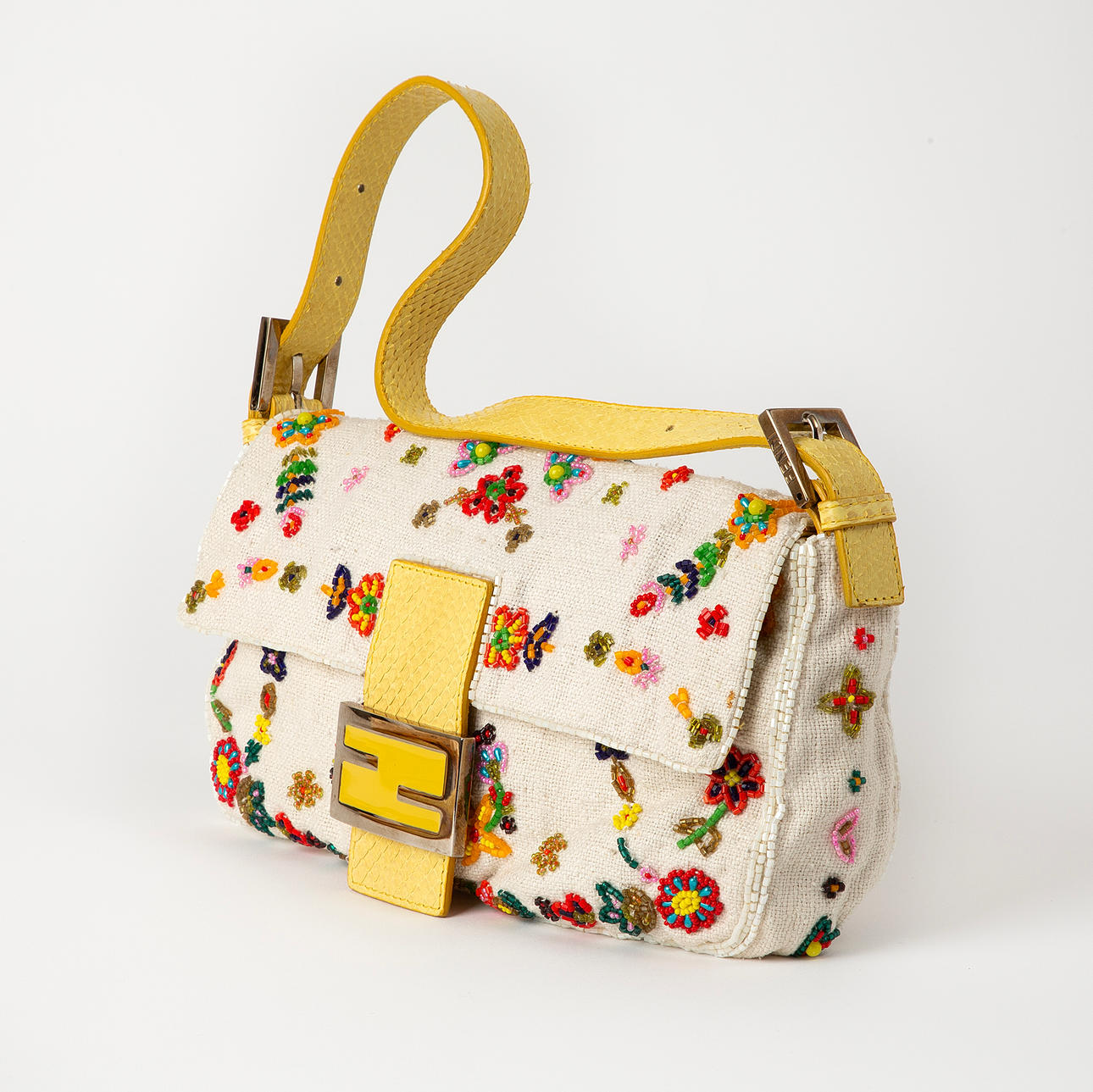 Limited edition från tidigt 2000-tal. Handbroderad med pärlor på bomullstextil. Magnetstängning med emaljerad Fendi-logotyp. Justerbar/avtagbar axelrem av pytonläder. Invändigt klädd med siden.