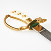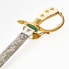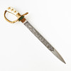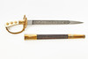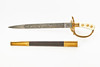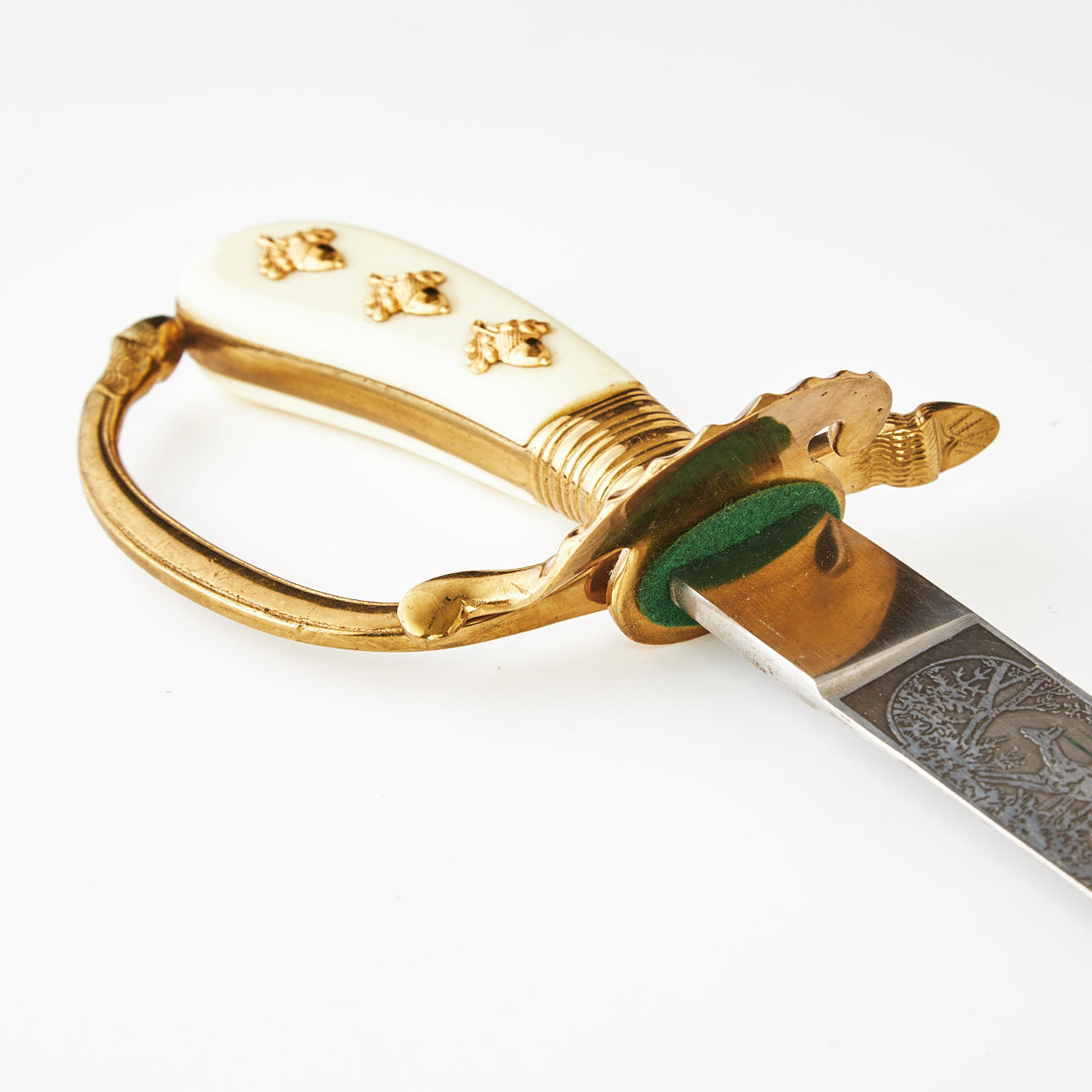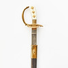 Etsad klinga med jaktmotiv, märkt Eickhorn, Solingen, förgyllt mässingsfäste, kavelplattor av benimitation med förgyllda ekollon, balja av svart läder med två förgyllda mässingsbeslag, längd 45 cm.