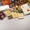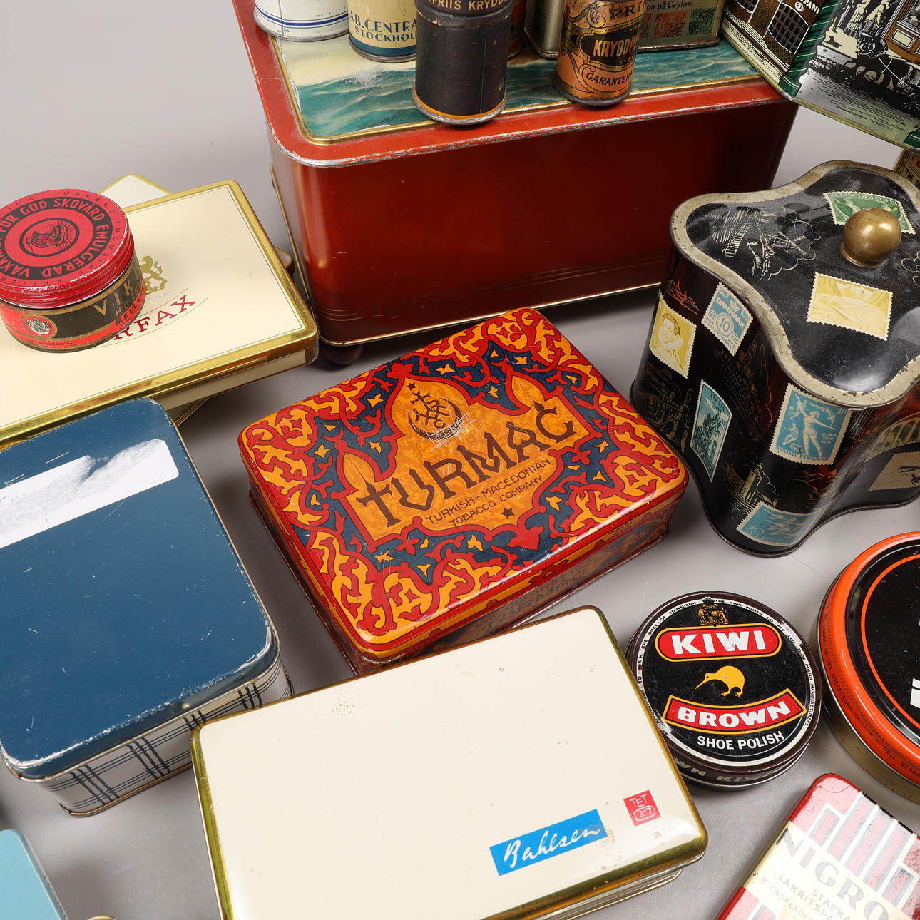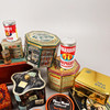 En samling plåtemballage av olika märken.