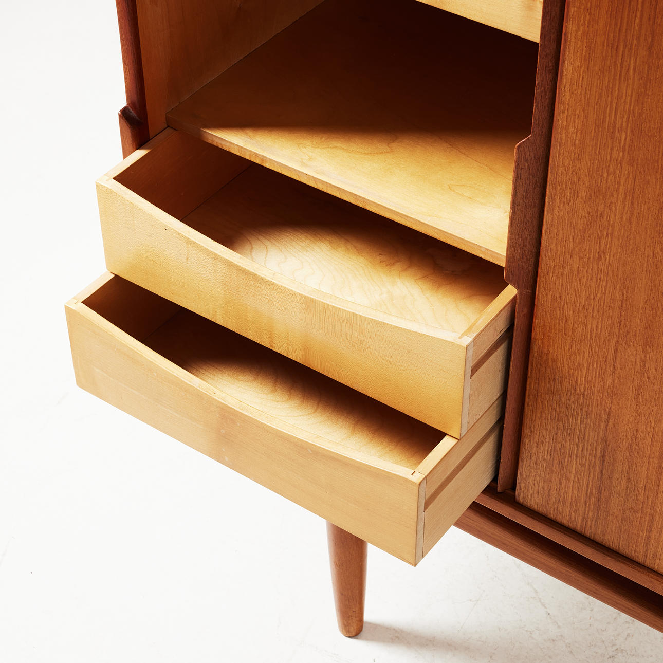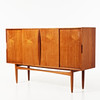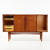 Teak, fyra skjutdörrar, inredd med lådor och hyllplan, mått ca 110,180x46cm.