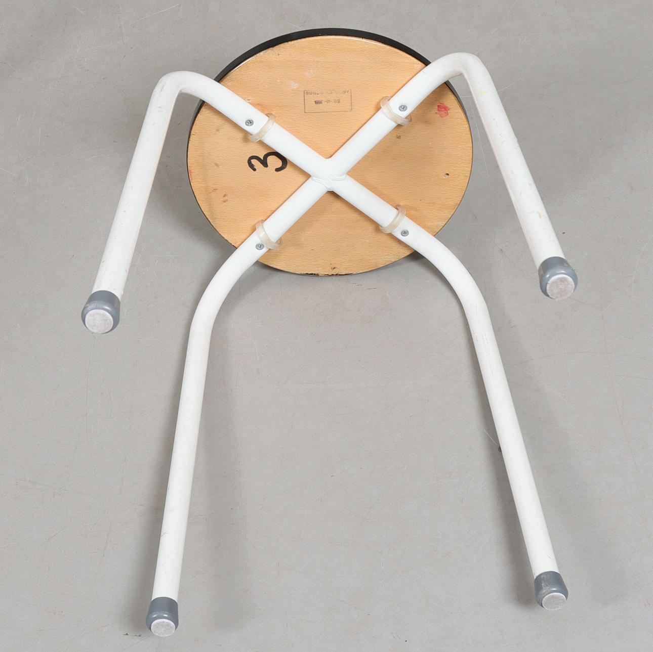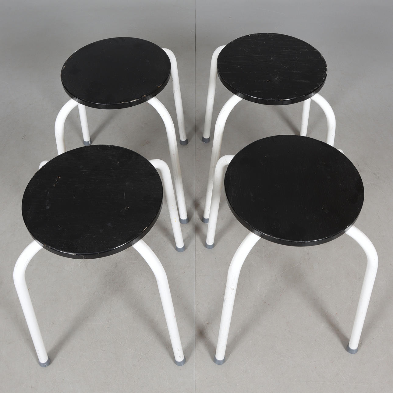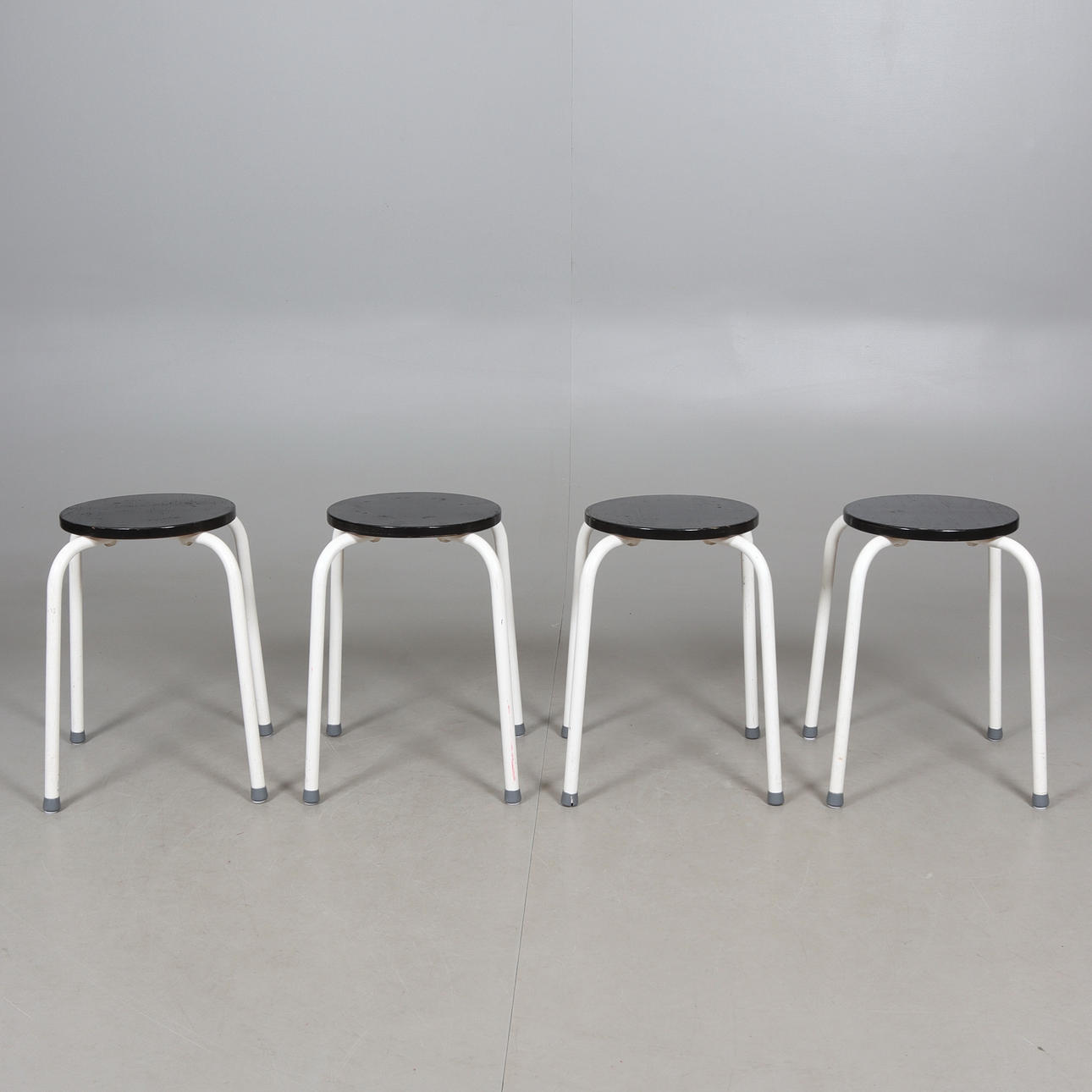 Stålrör och träsitsar, stämpelmärkta, sitthöjd ca 46, sitsarnas diameter ca 29 cm.