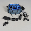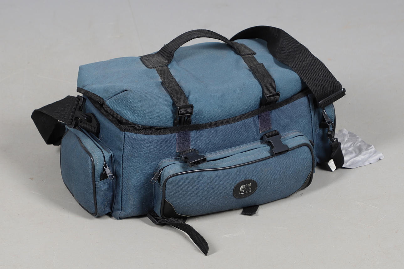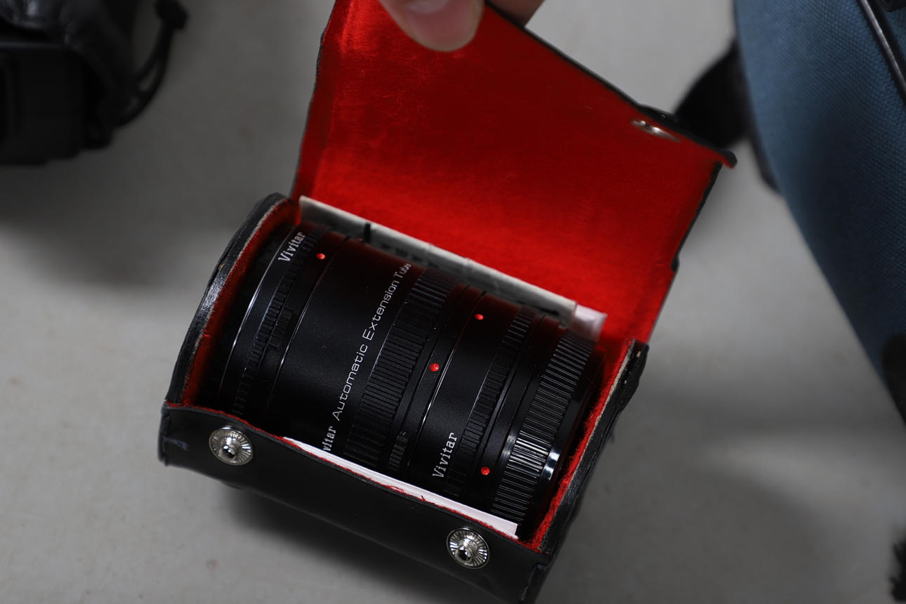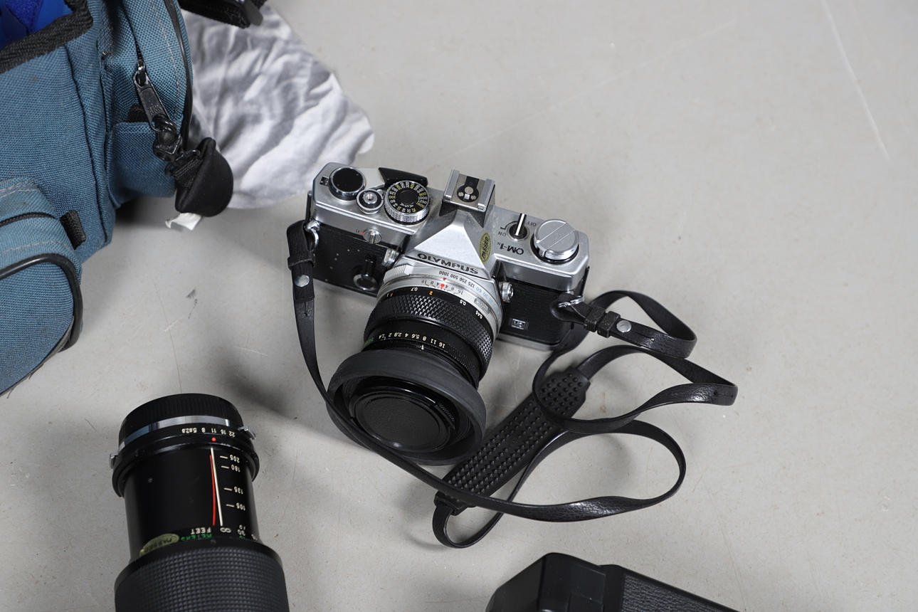 En Olympus OM-1-kamera med 50 mm Olympus Zuiko-objektiv, även med en Vivitar 75-205 mm Macro Focusing Zoom-lins, Vivitar Automatic Extension Tube, 2 x matchad multiplikator, blixtpistol och tillbehör. I ett mjukt fodral. Fodral 46 cm bred, 25 cm hög.