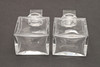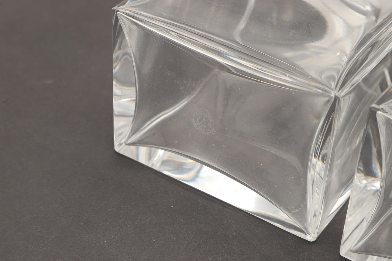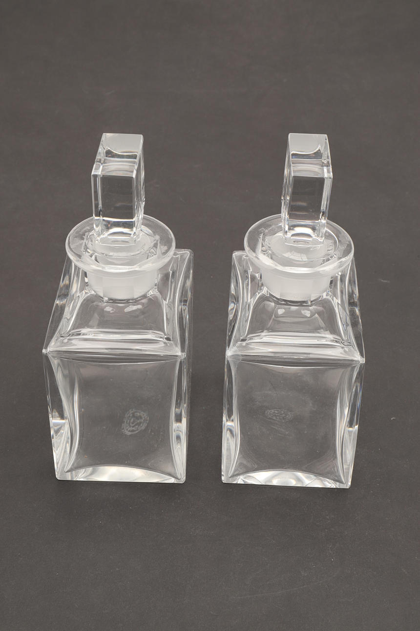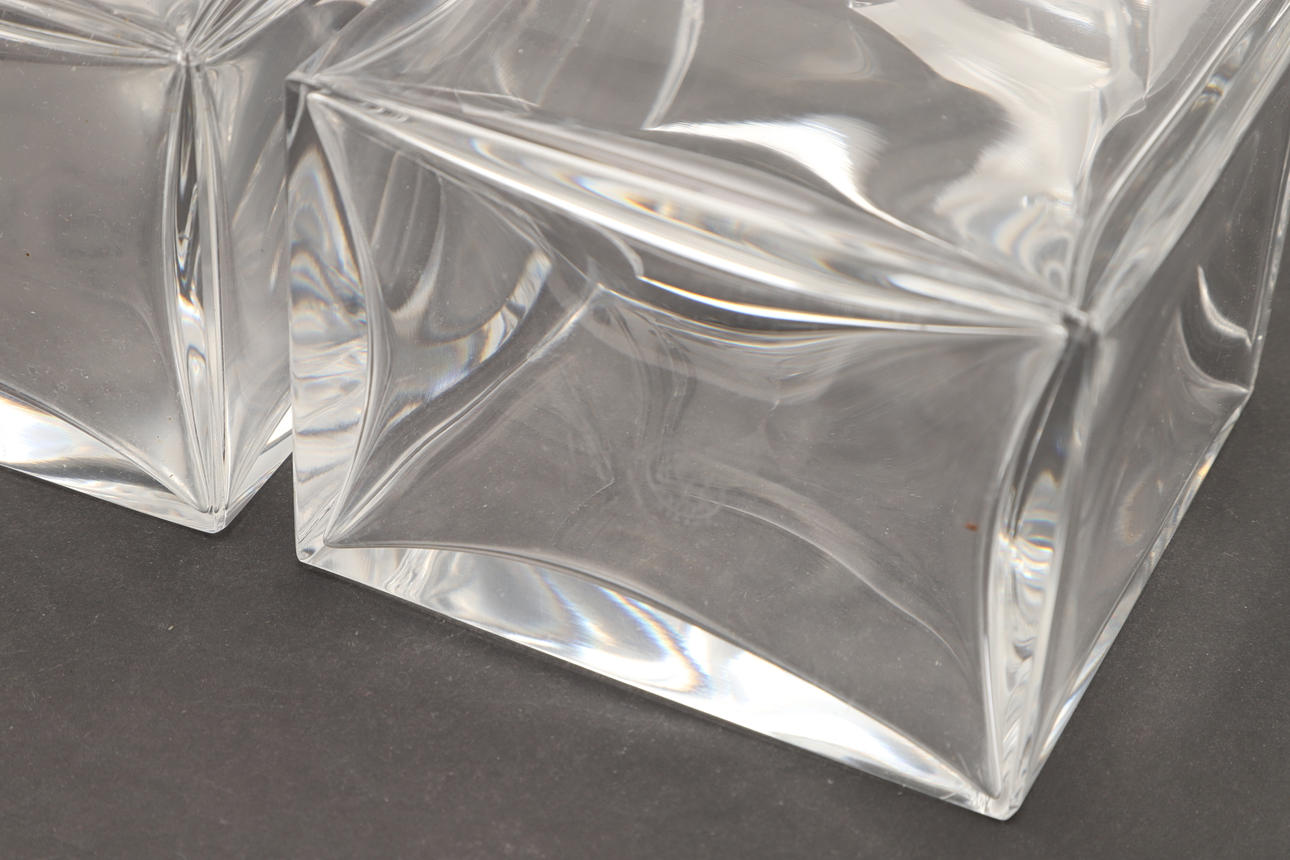 Ett par fyrkantiga karaffer med matchande proppar. Var och en med ett stämplat märke för Baccarat. 20 cm hög.