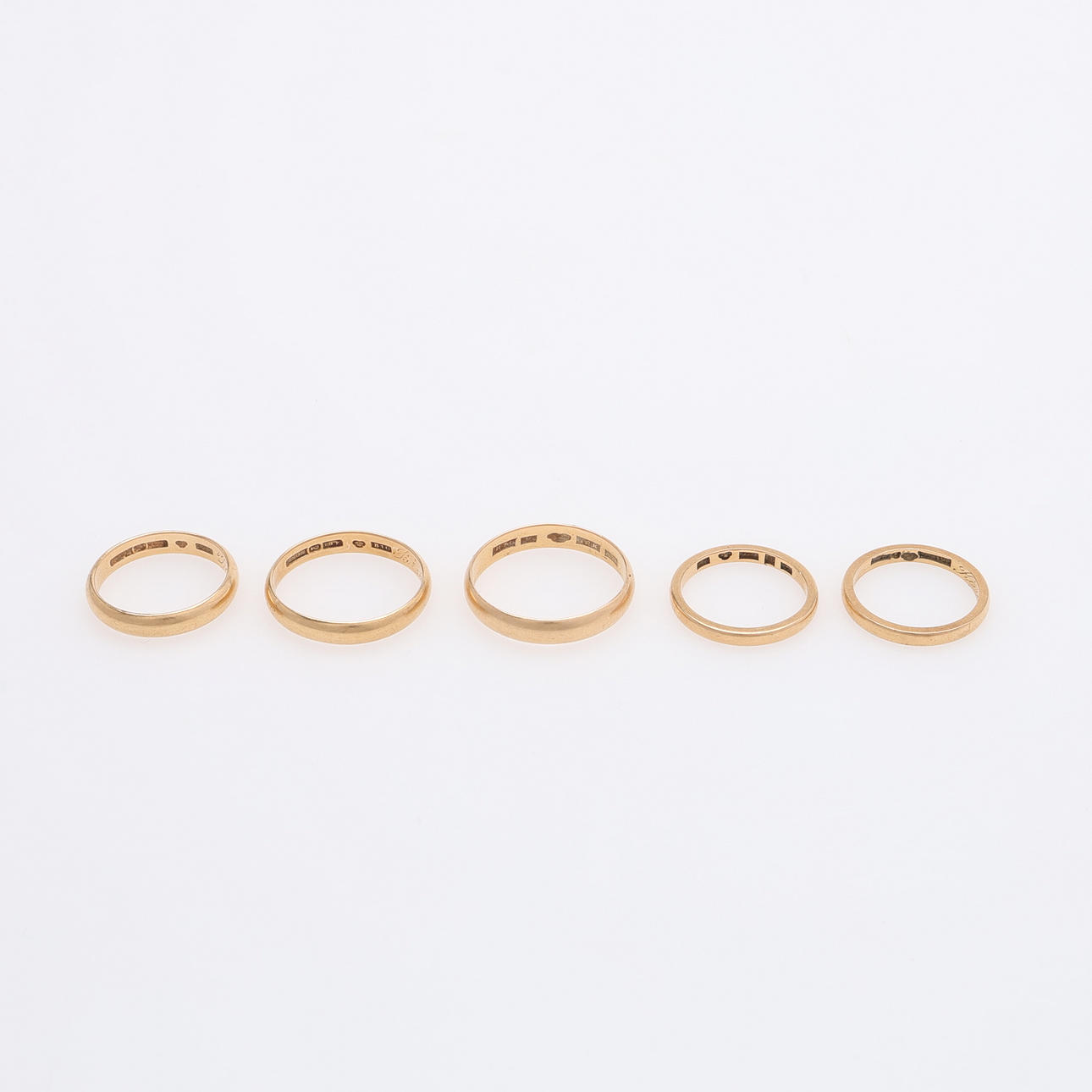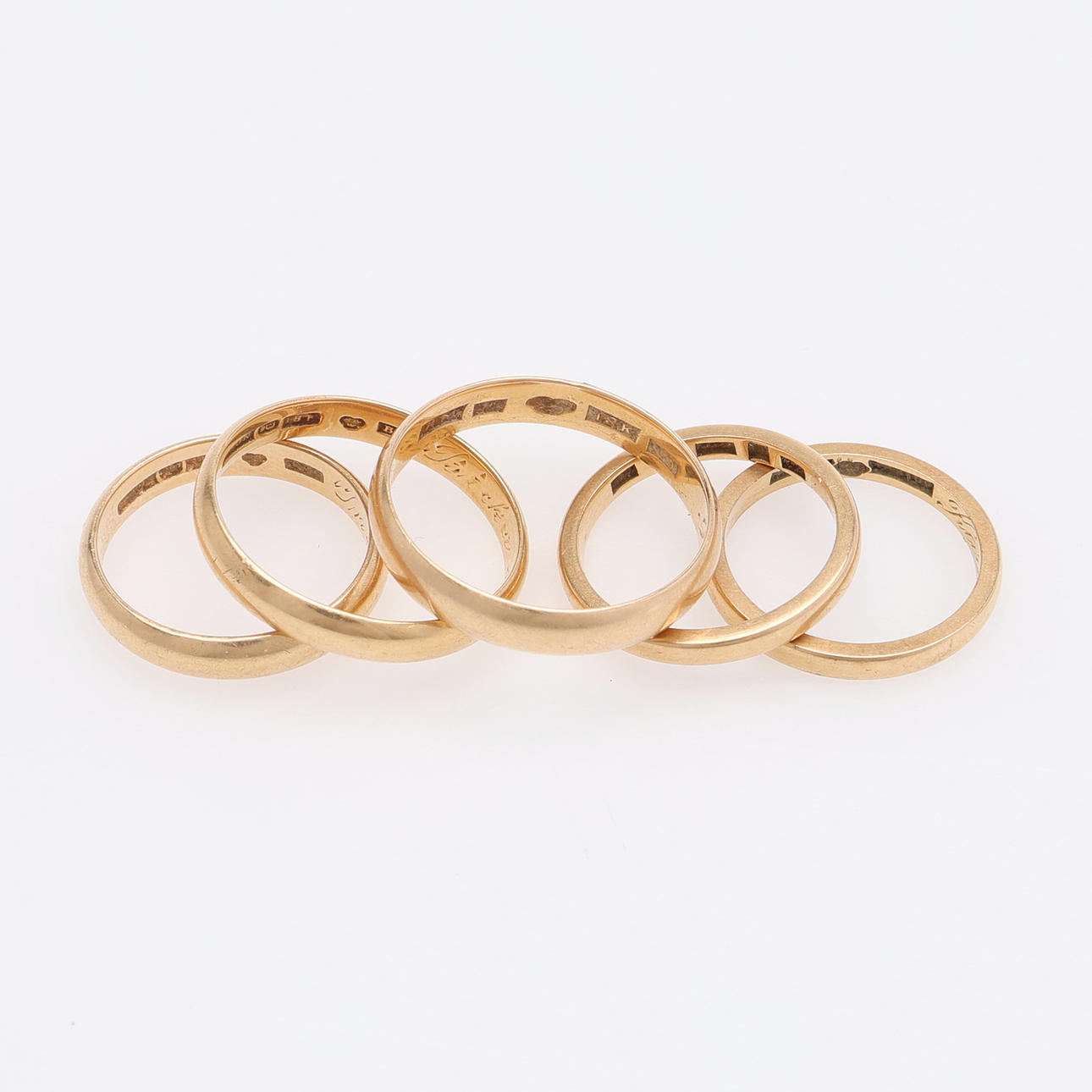 4193578. SLÄTA RINGAR, 5 ST, 18K GULD, TOTAL VIKT 19,2 GRAM.