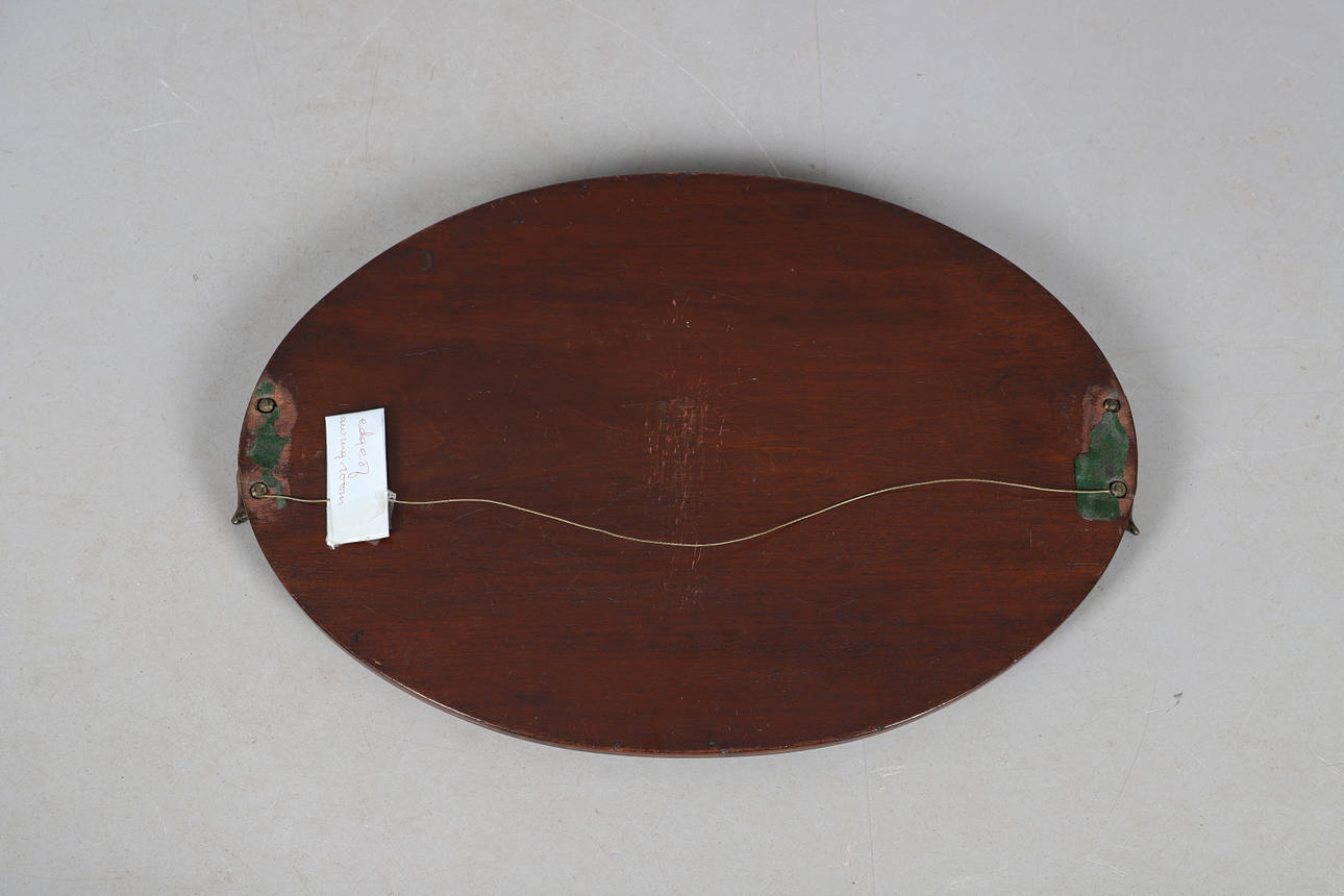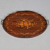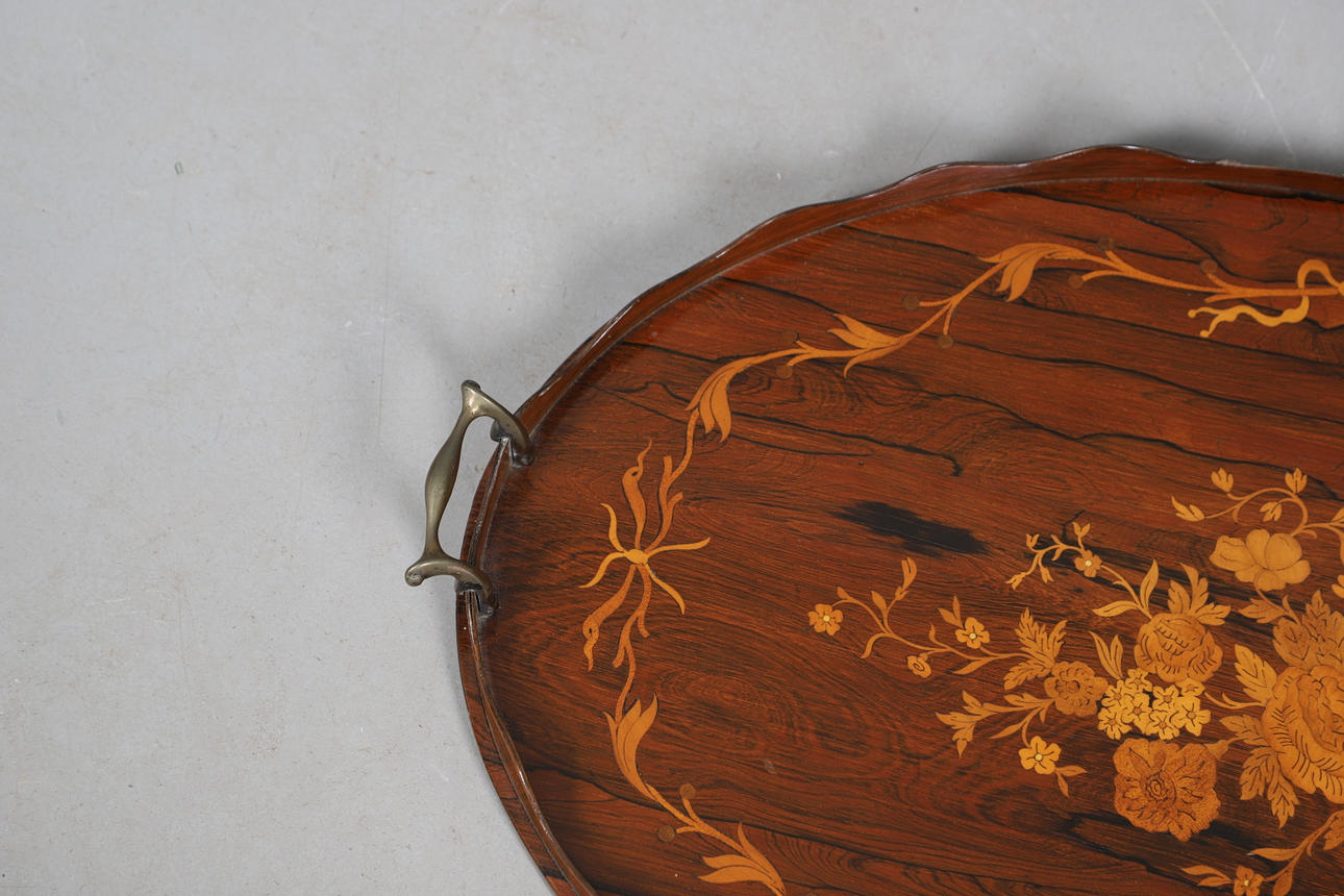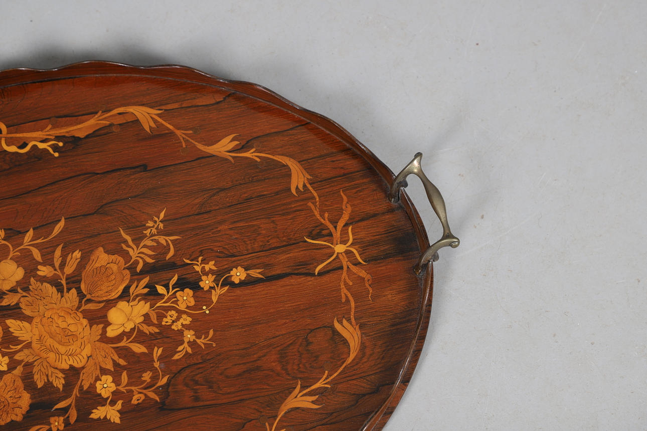 av oval form med formad galleri, mitten med inlagda bladsträngar, 62cm x 42cm.