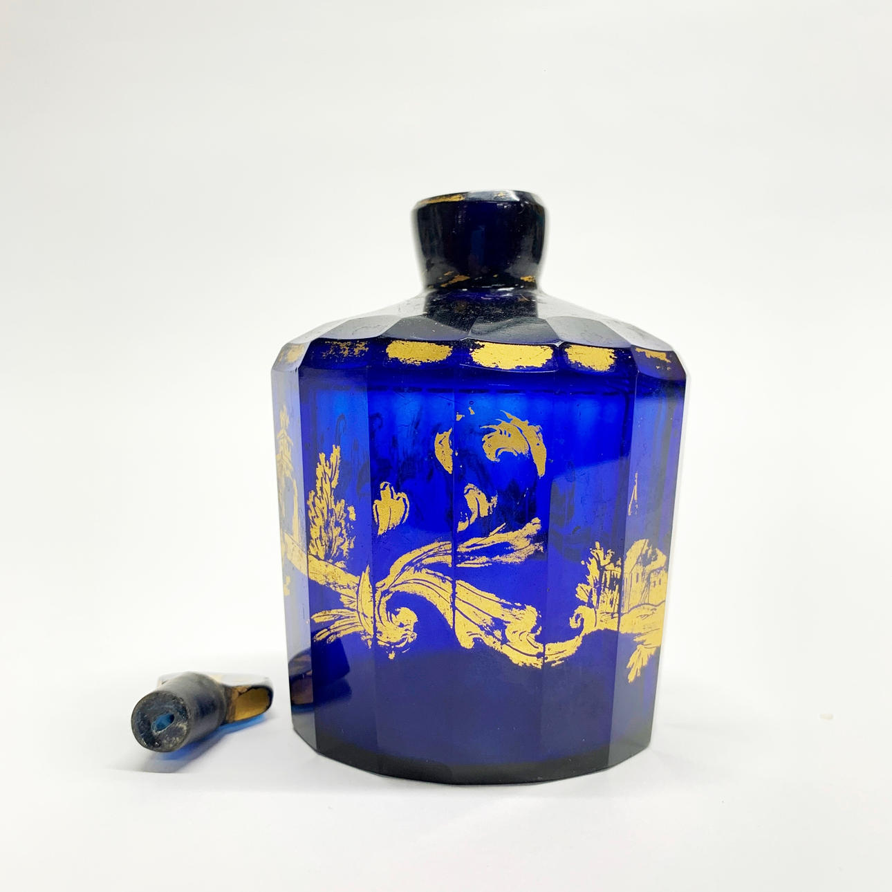 PARFYMFLASKA, 19THC, förgylld Bristol blå glas, H. 11,5 cm.