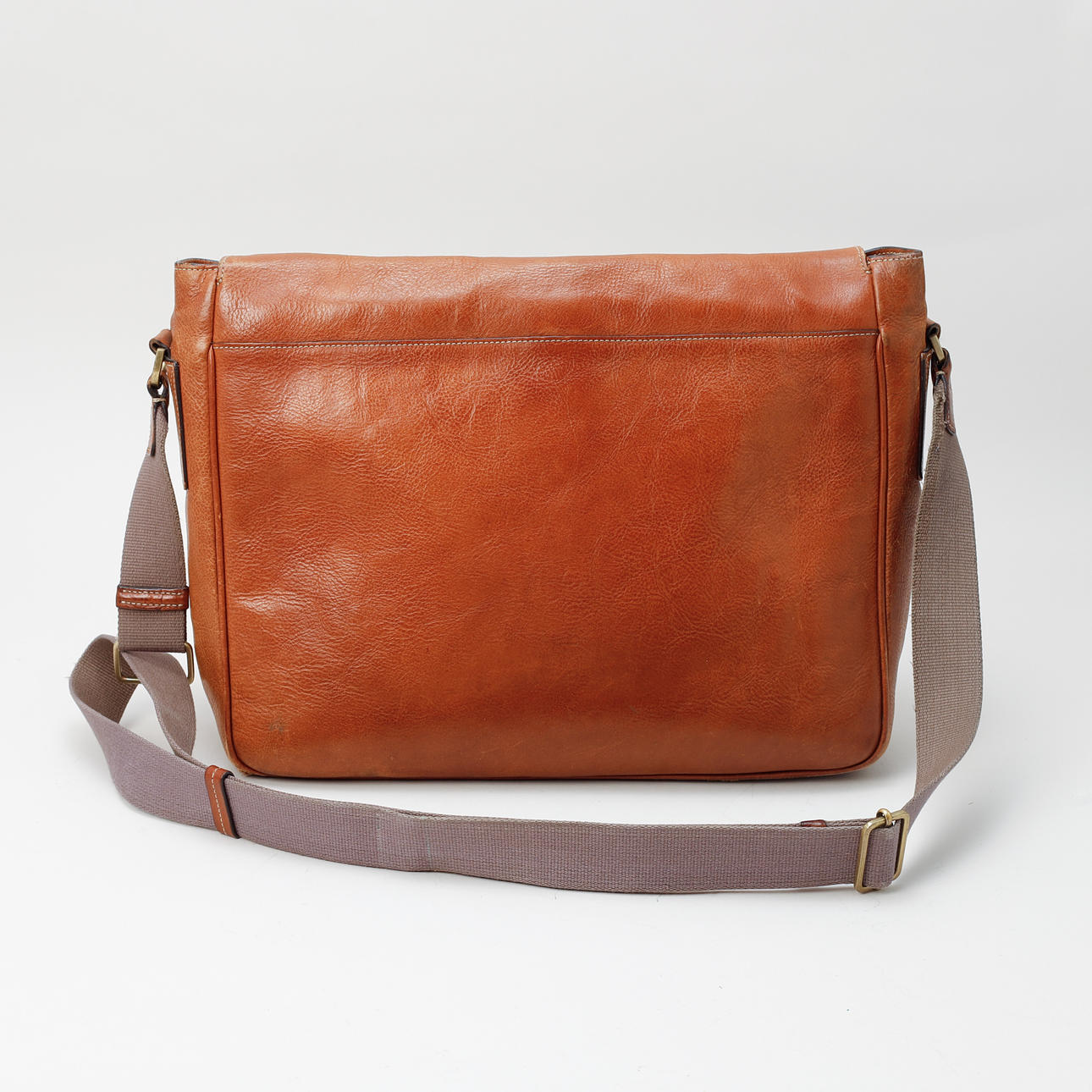 Läder. Axelrem i textil. 40 x 10 x 30.