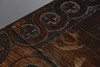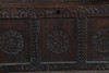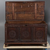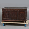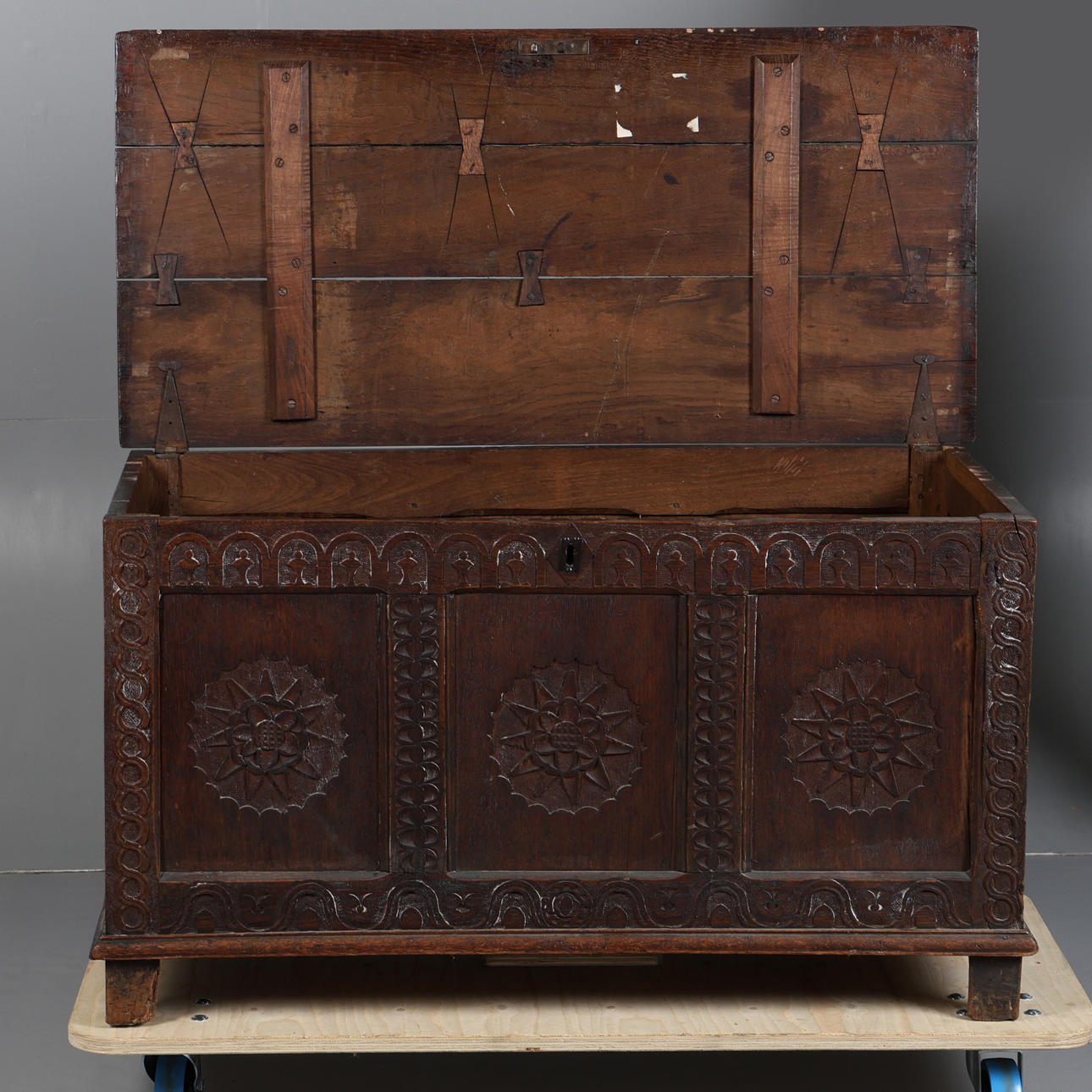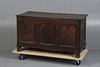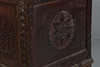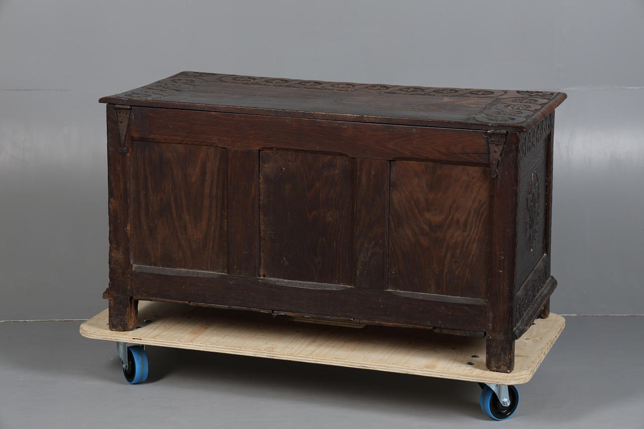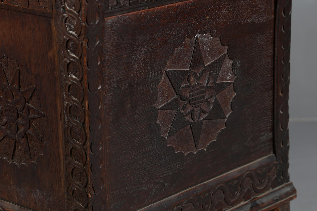 Med en topp i tre plankor med en sammanflätad cirkelsnidad design, framsidan med en välvd snidad fris och tre paneler snidade med blommiga stjärnmotiv, sidorna snidade med samma blommiga stjärnmotiv och med en lummig S scroll nedre fris, ovanför en gjuten kant och blockfötter, 110 cm bred 61,5 cm hög 53,5 cm djup.