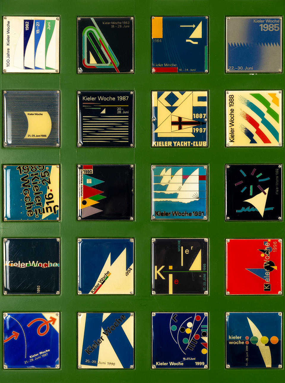 Samling av alla 50 Kiel Week-märken mellan 1969 och 2019, samt ett klistermärke från Kiel Yacht Club för 100-årsjubileet (1887 - 1987).