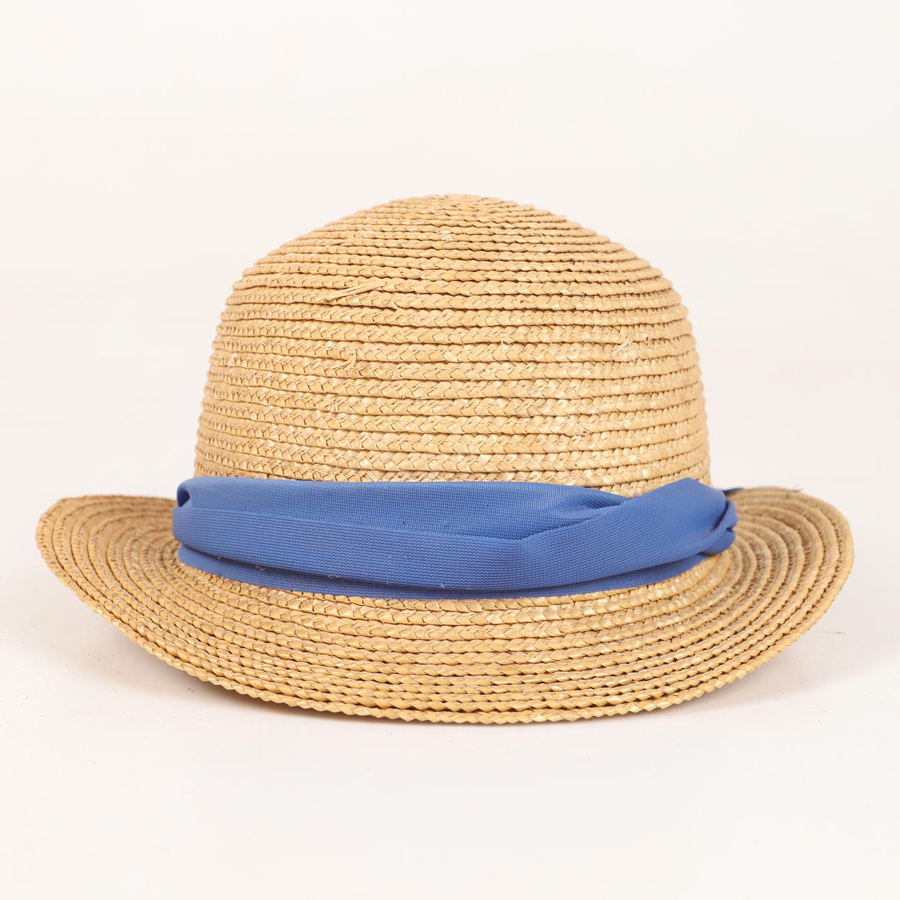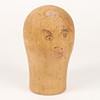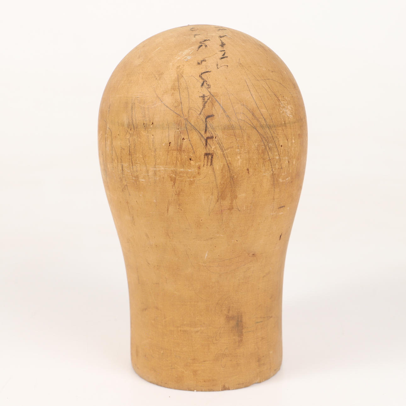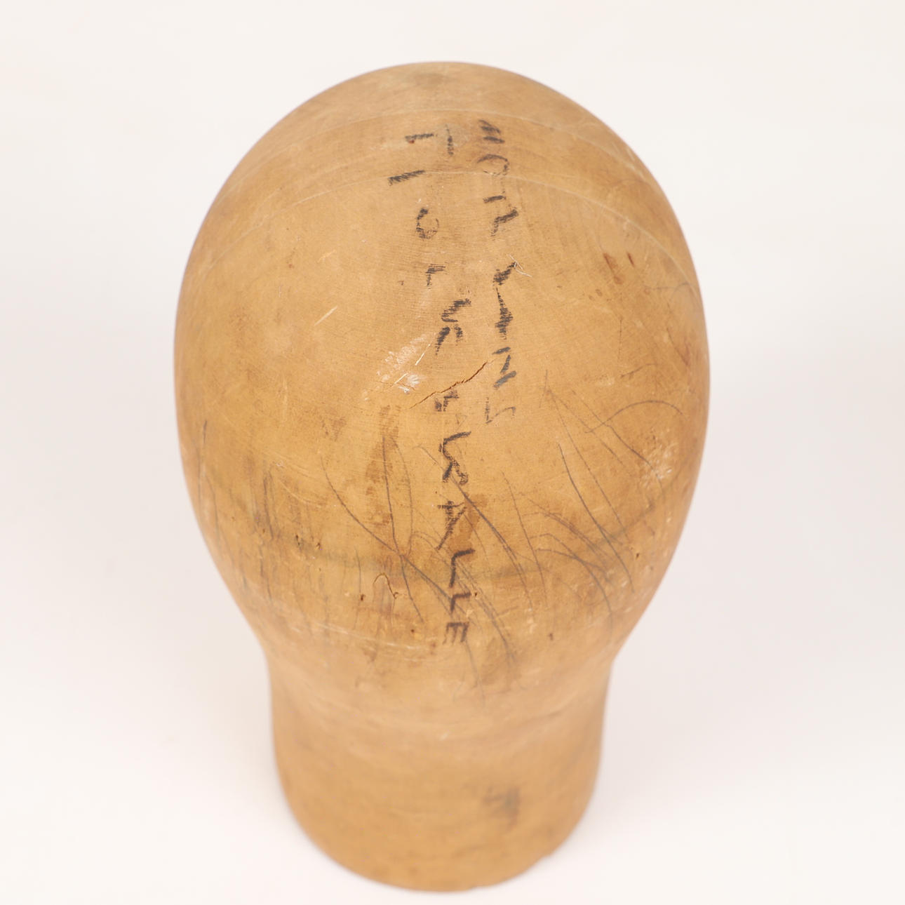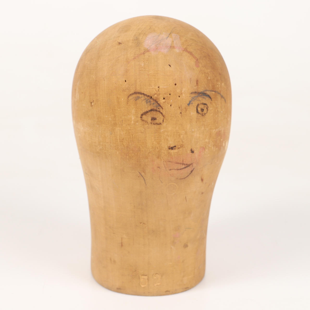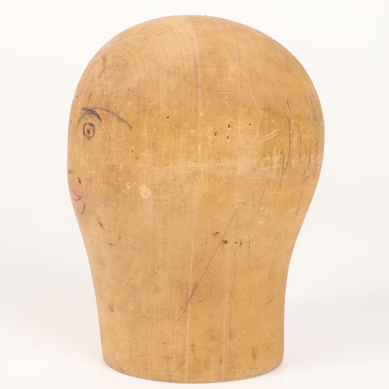 Perukstock, storlek 52, ca 14 x 17, höjd ca 24 cm Basthatt med knytband, uppskattad storlek 53.