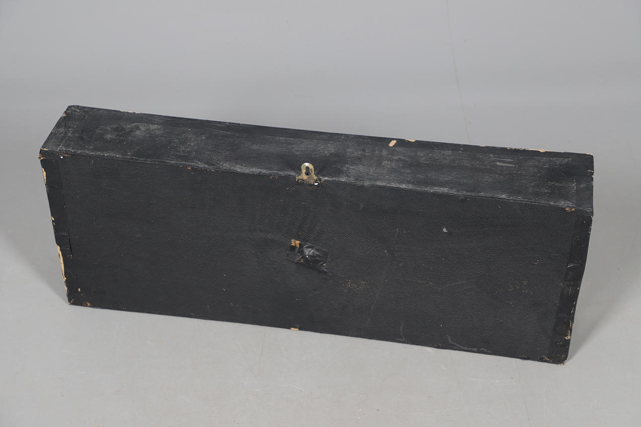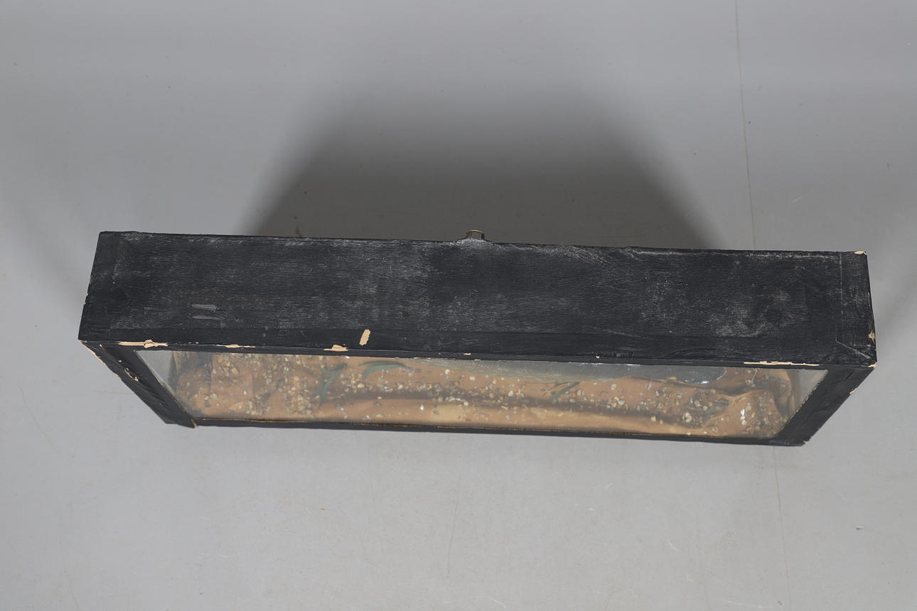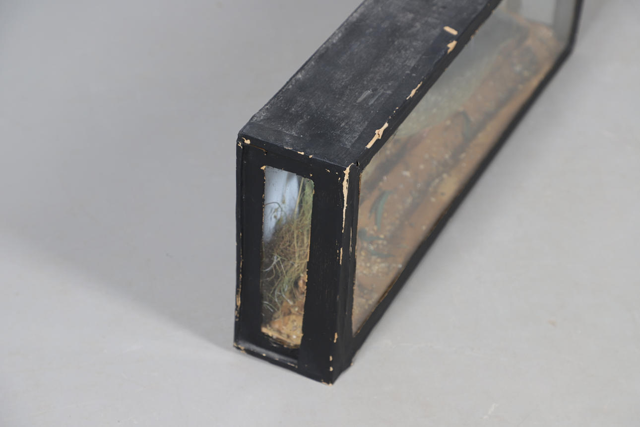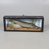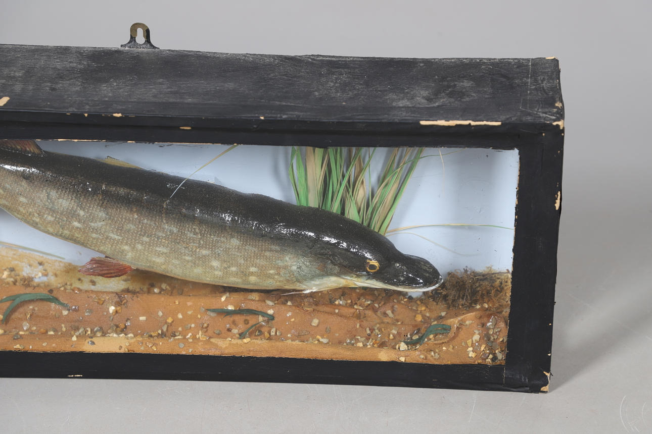 För väggmontering monteras den lilla gäddan i fodralet med extra landskap. Höjd 26,5 cm x bredd 69 cm x djup 11 cm.
