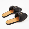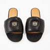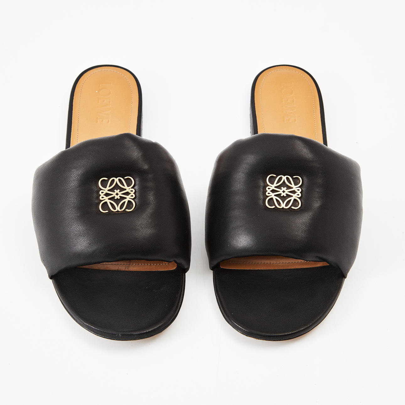 I svart skinn, vadderade, märkning i gulmetall fram, invändigt i ljust skinn, märkt "Loewe", storlek 41, längd ca 27.5cm.