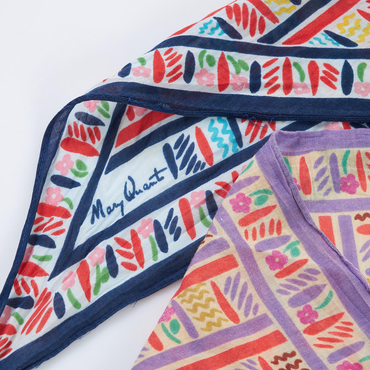 4204732. MARY QUANT. 2 st scarf, bomull, polykrom dekor, märkta.