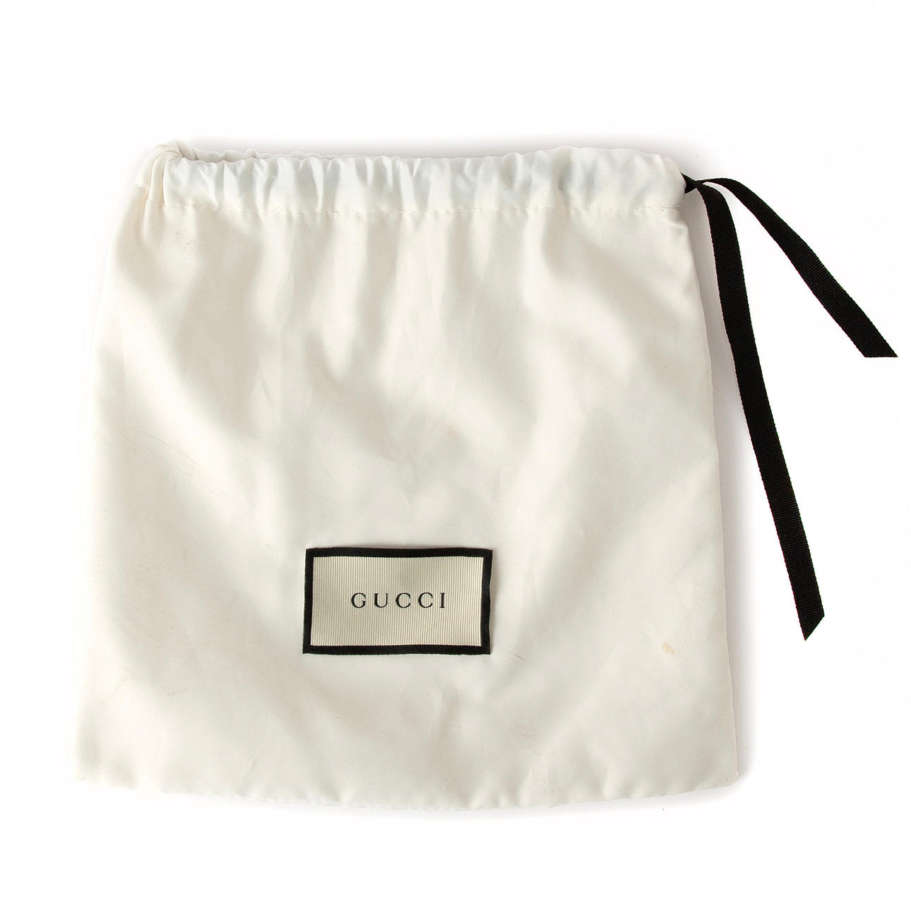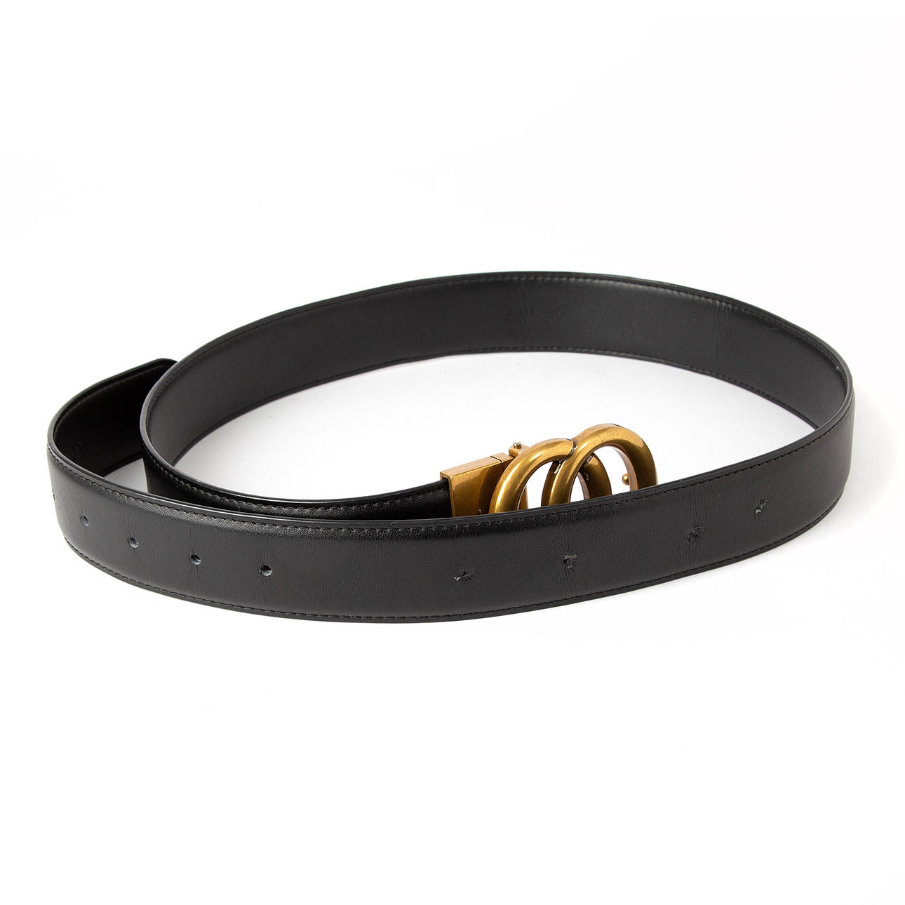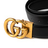 Svart med mässingsspänne i form av GG-logotyp. "Gucci" etsat på spänne.