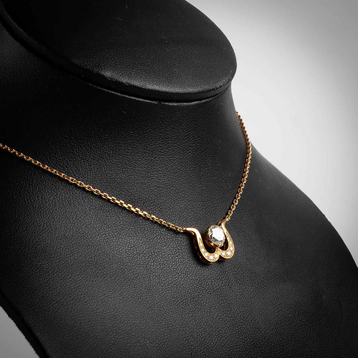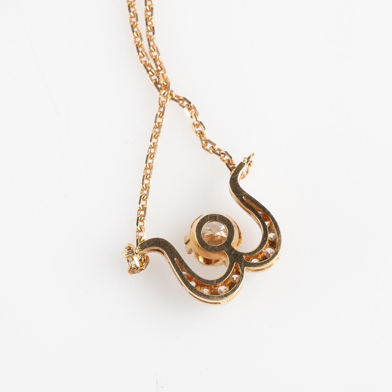 Integrerad kedja med karbinlås. L ca 42,5 cm. Vikt ca 6,1 gram.
