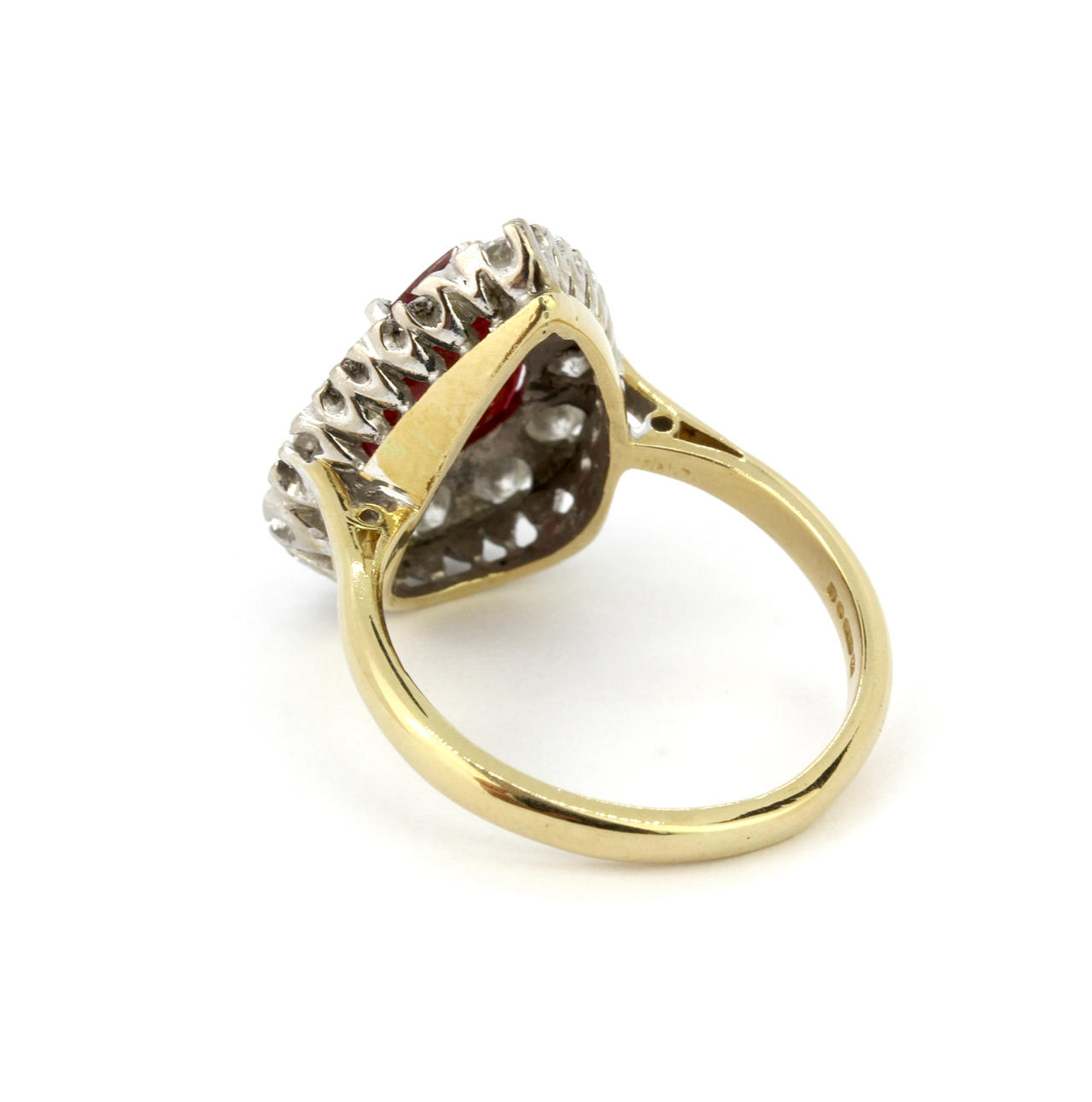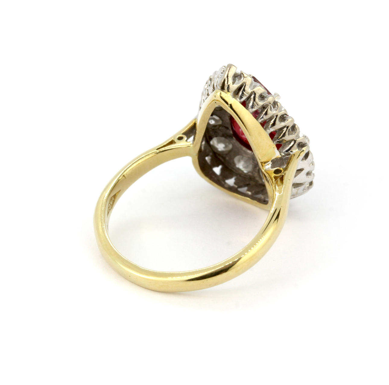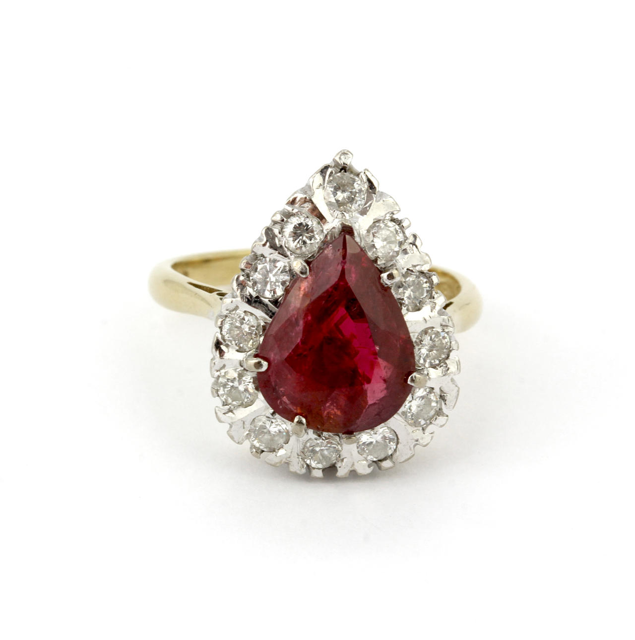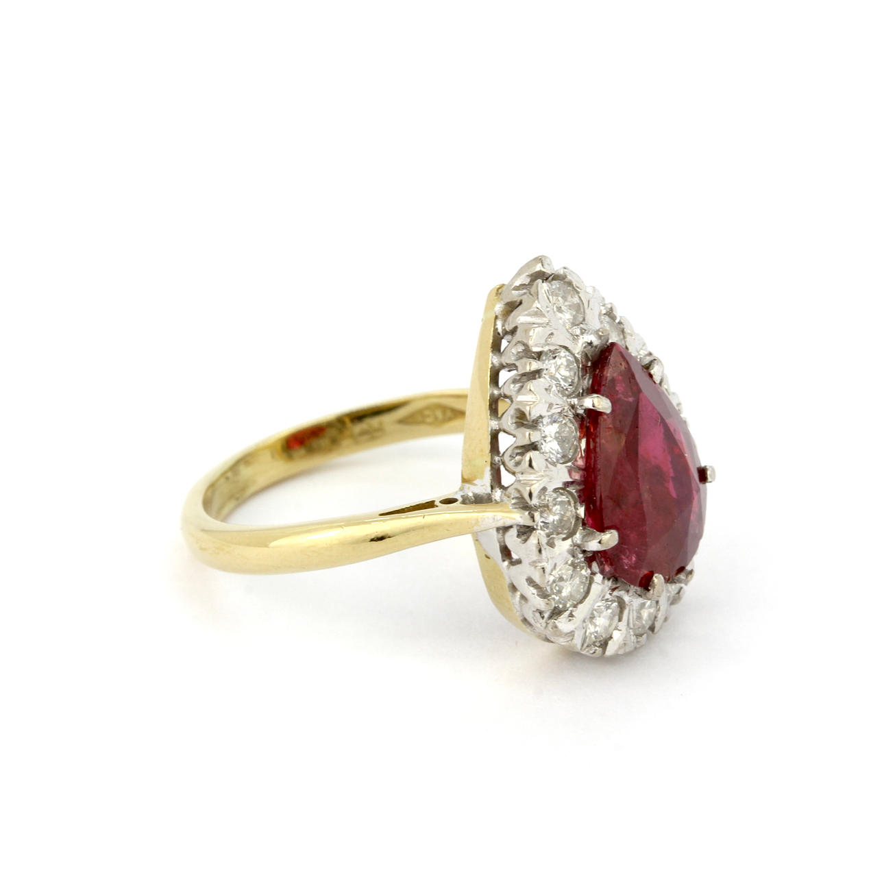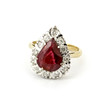 En klusterring i 18 karat gult guld med päronslipad rubin omgiven av diamanter.