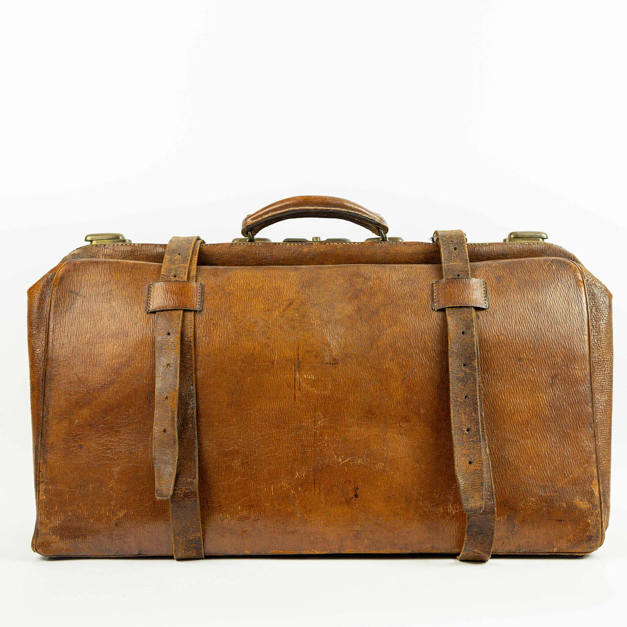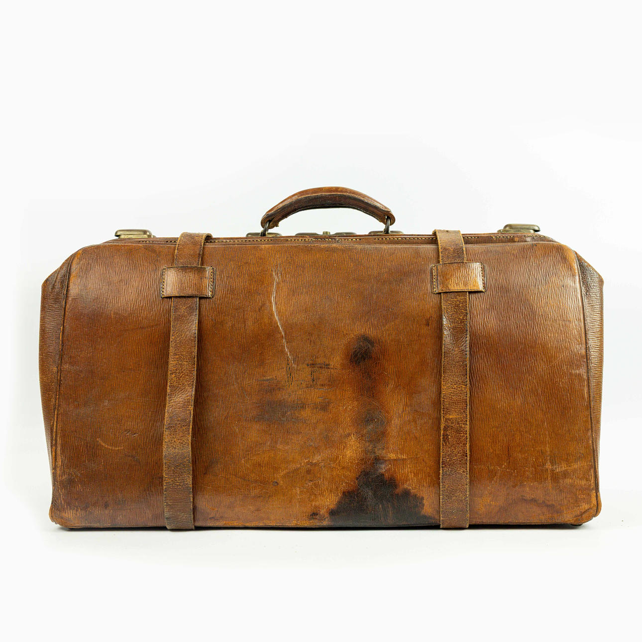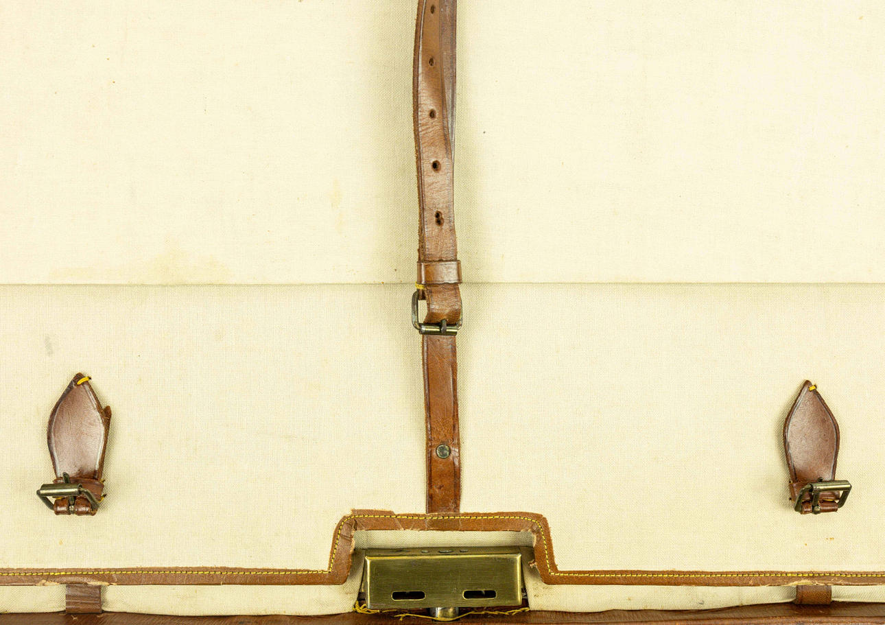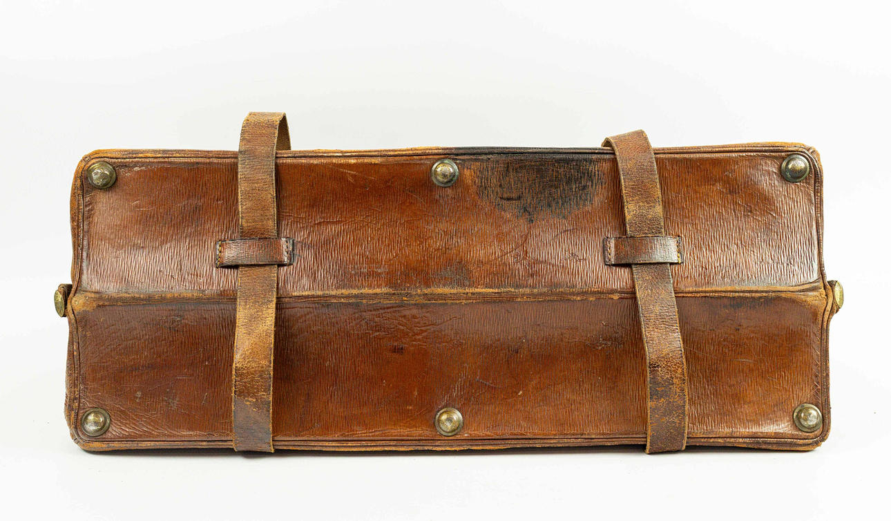 En stor läderväska, det djupa glansiga mahognyläderfodralet med originalremmar, handtag, spännen och säkra engelska lås, 60 cm x 33 cm H x 25 cm.