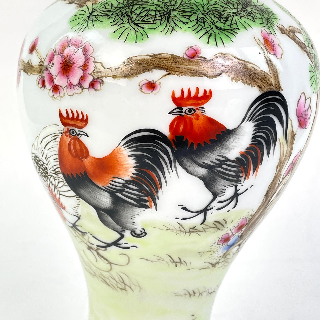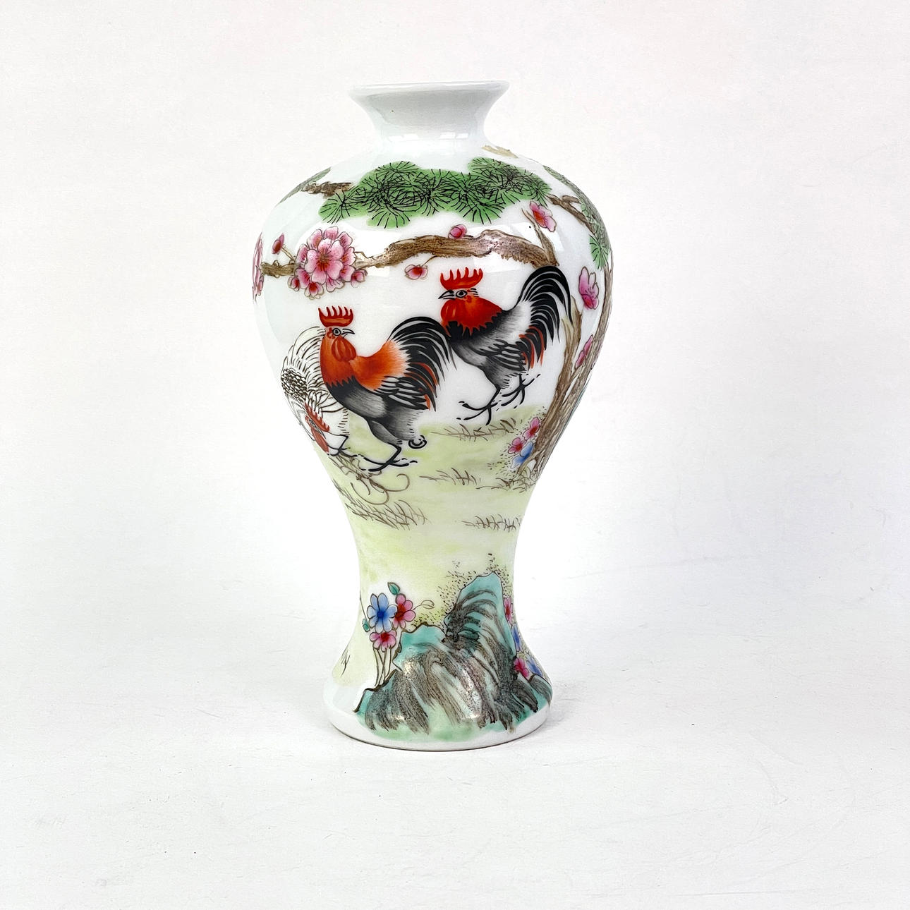Kinesisk vas i porslin, motiv föreställande tuppar och körsbärsträd. Märkt undertill.