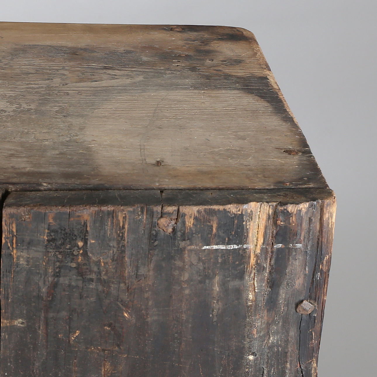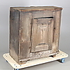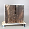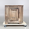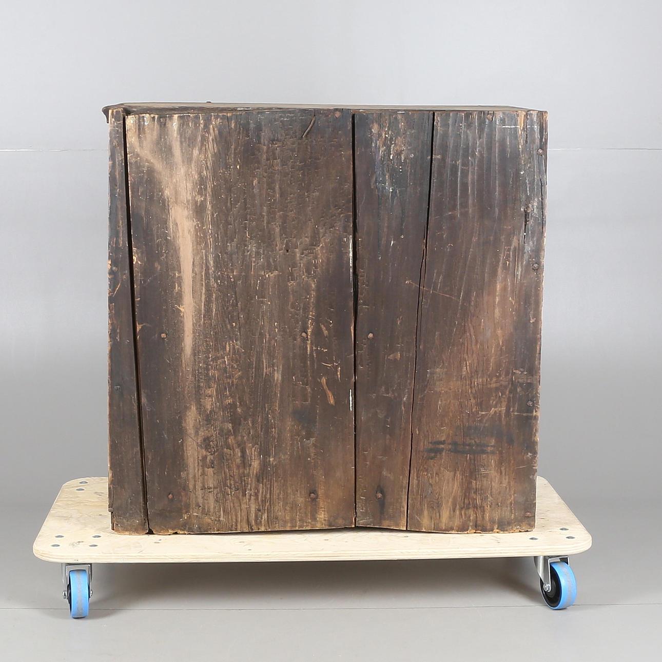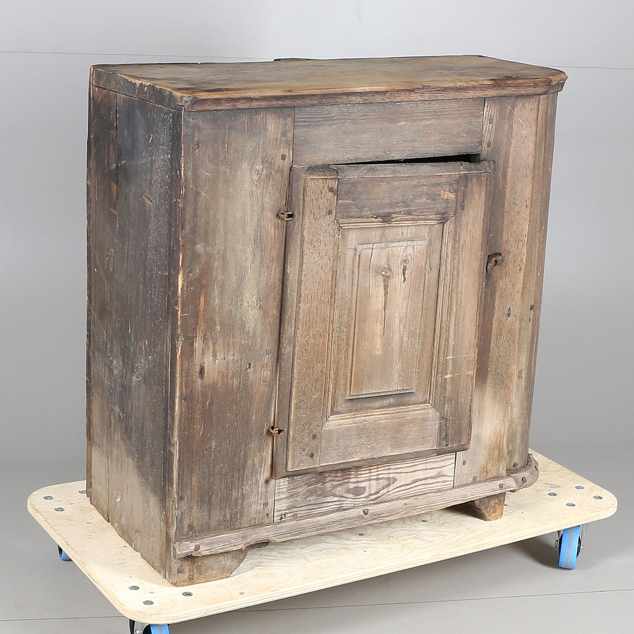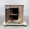 Med en rundad kortsida. Ett fast hyllplan invändigt. Längd 93,5 cm. Bredd 43 cm. Höjd 92 cm.
