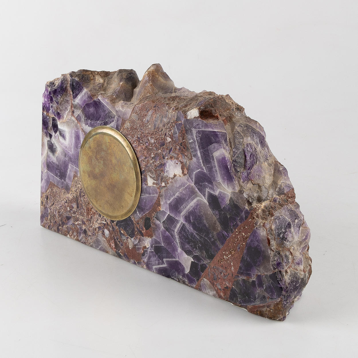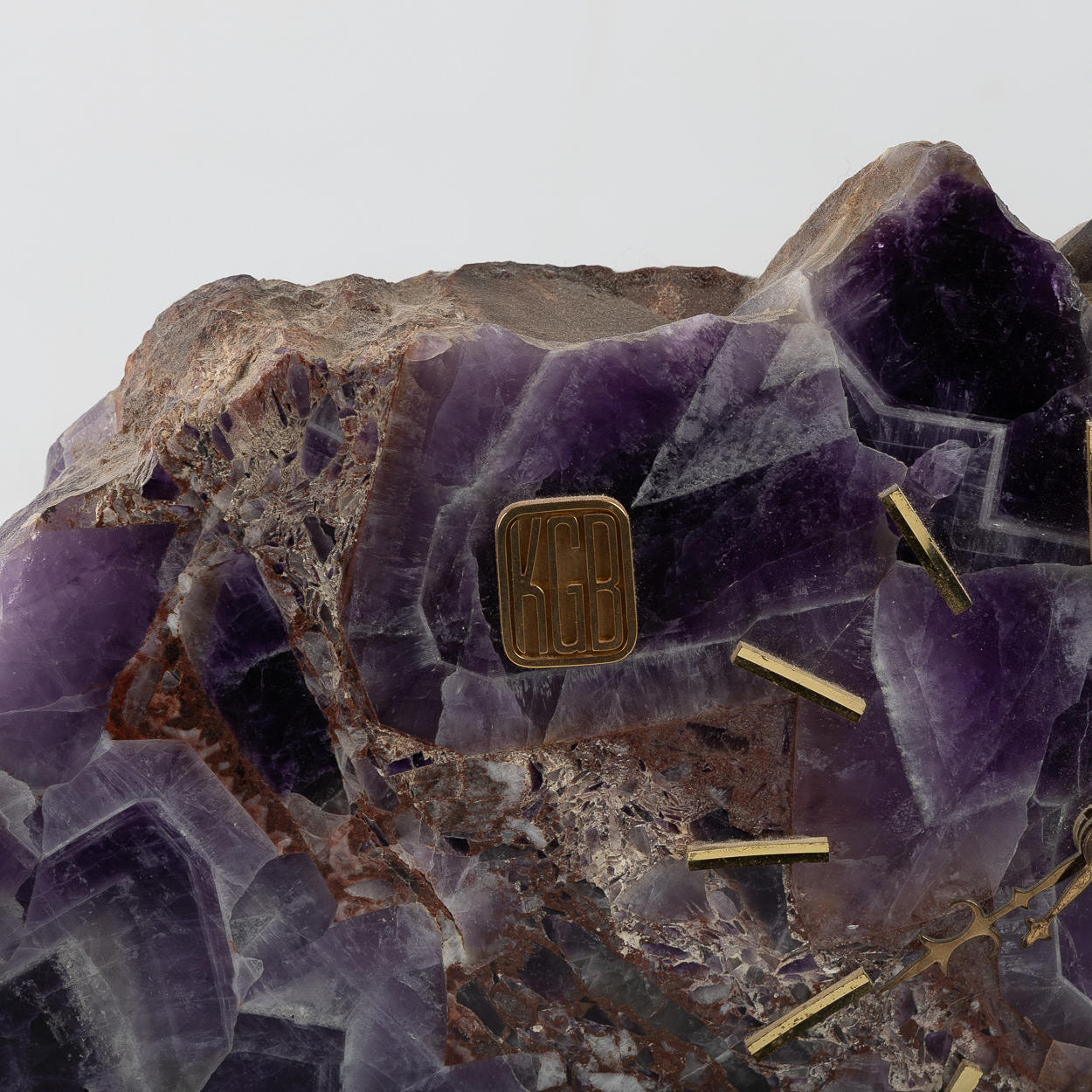 Bordsur gjort av ett ametistkluster. Med logga "KGB" och "Meister". Höjd 20 cm, bredd 35 cm.