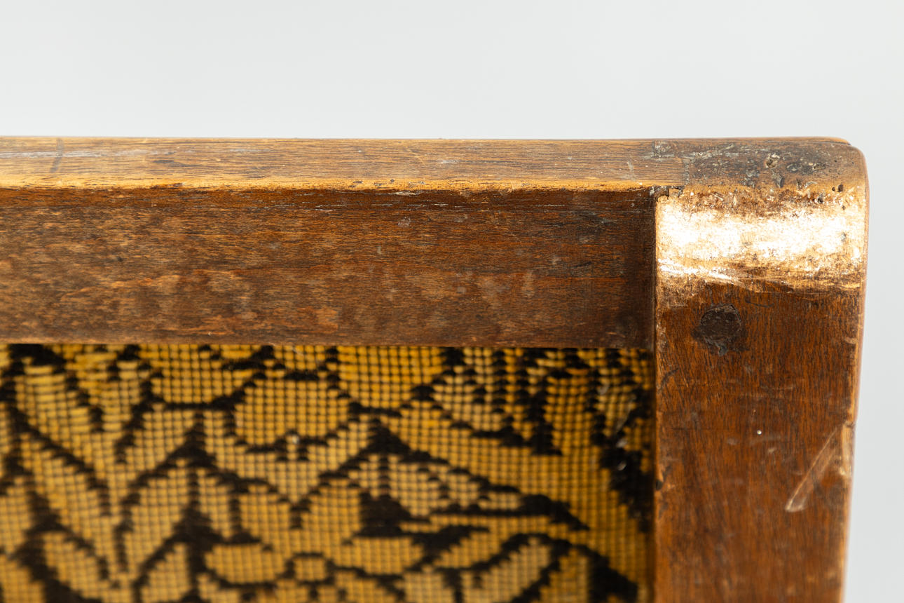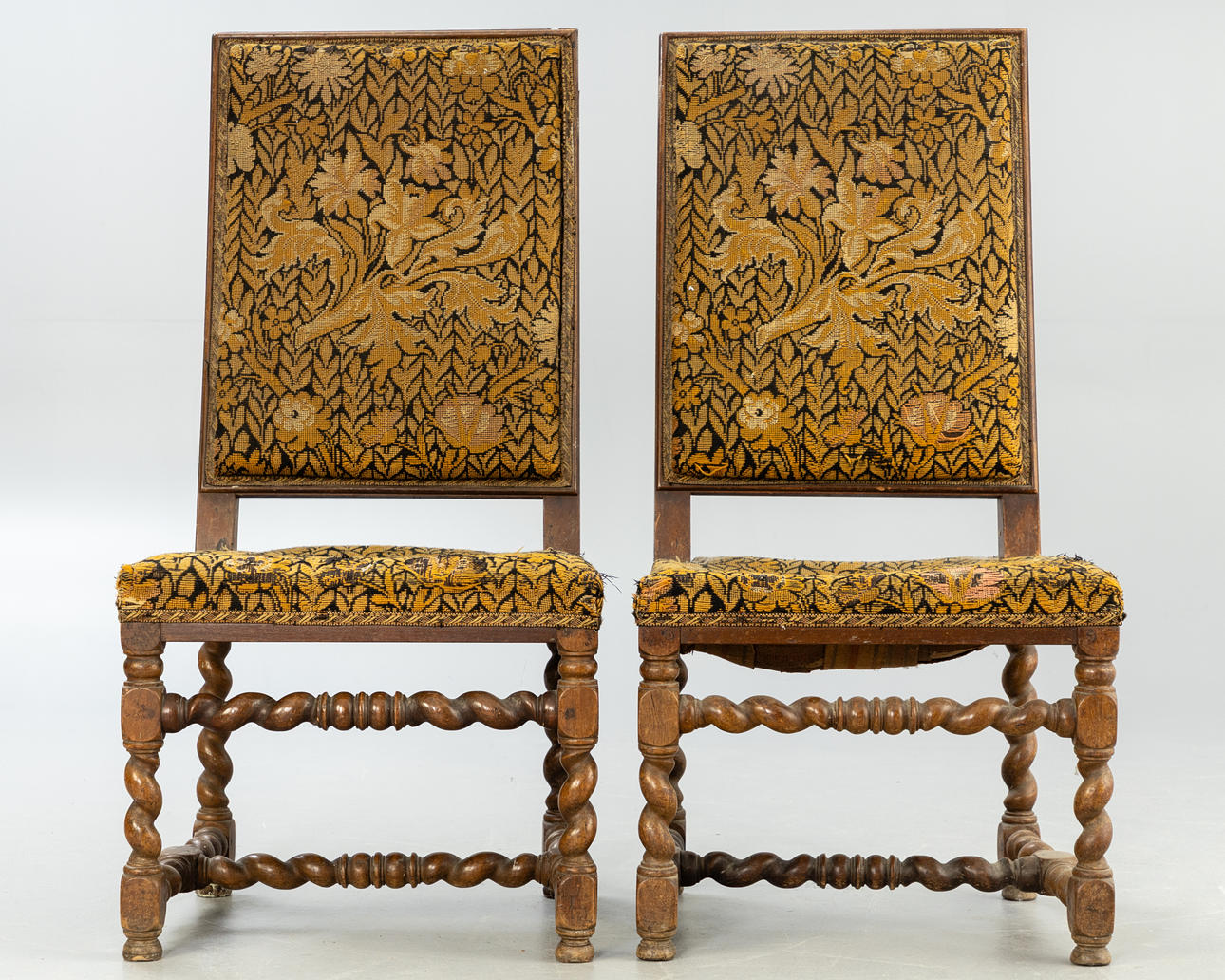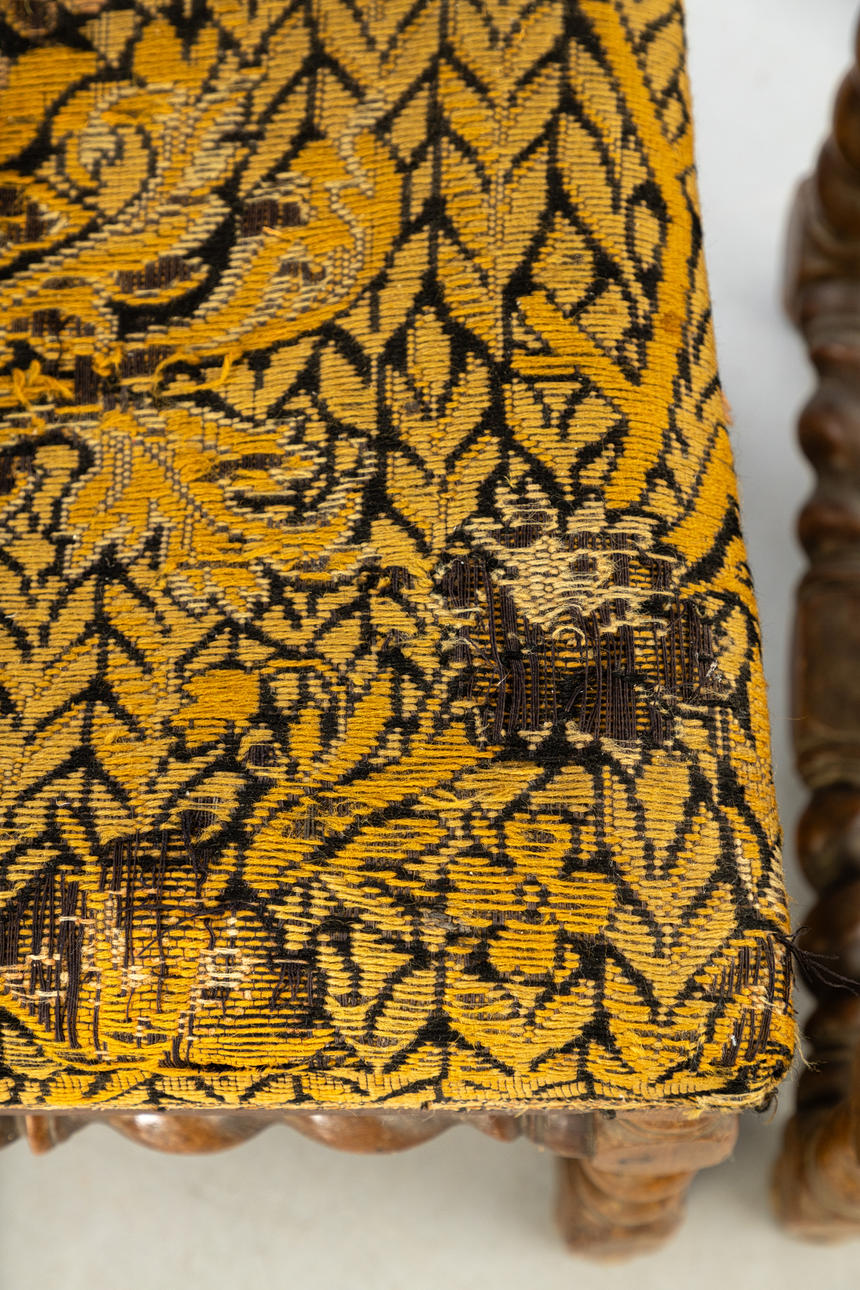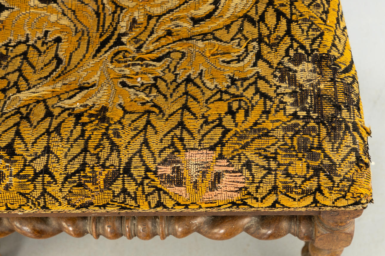 Svarvad ek Rektangulär, stoppad sits och rygg med grönsaksmönstrad gobelängöverdrag. Vridna ben och stag.