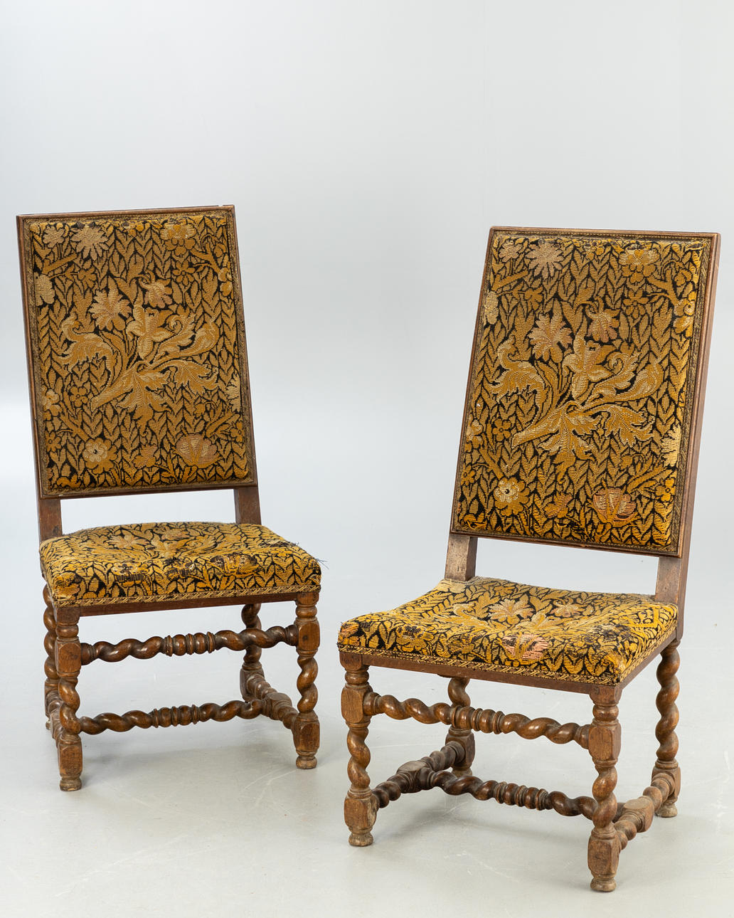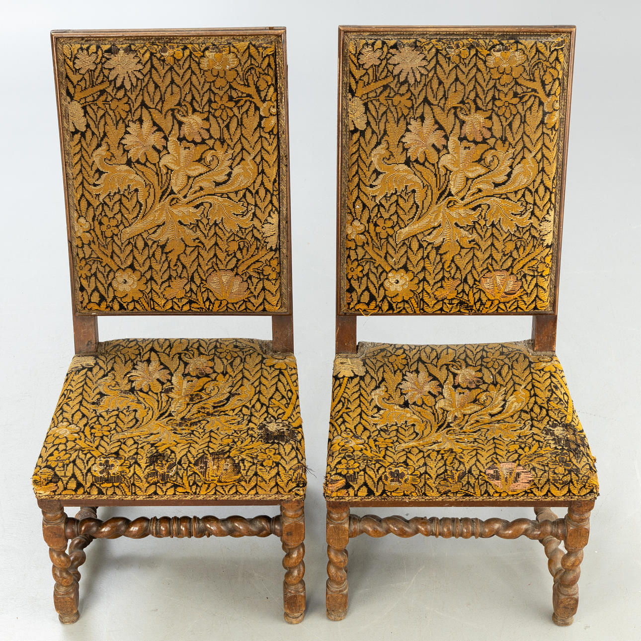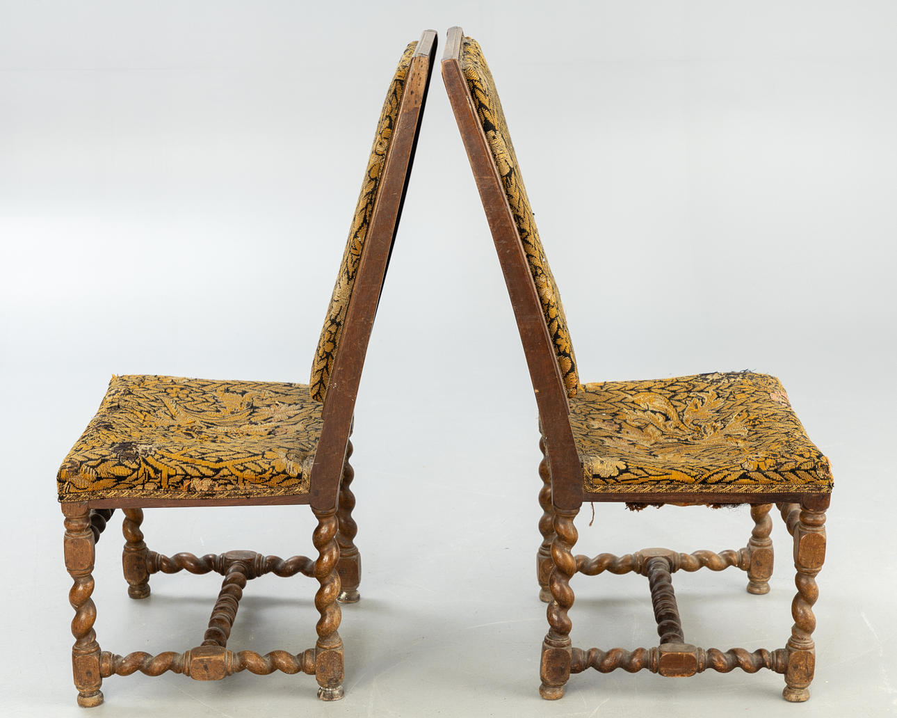 Svarvad ek Rektangulär, stoppad sits och rygg med grönsaksmönstrad gobelängöverdrag. Vridna ben och stag.