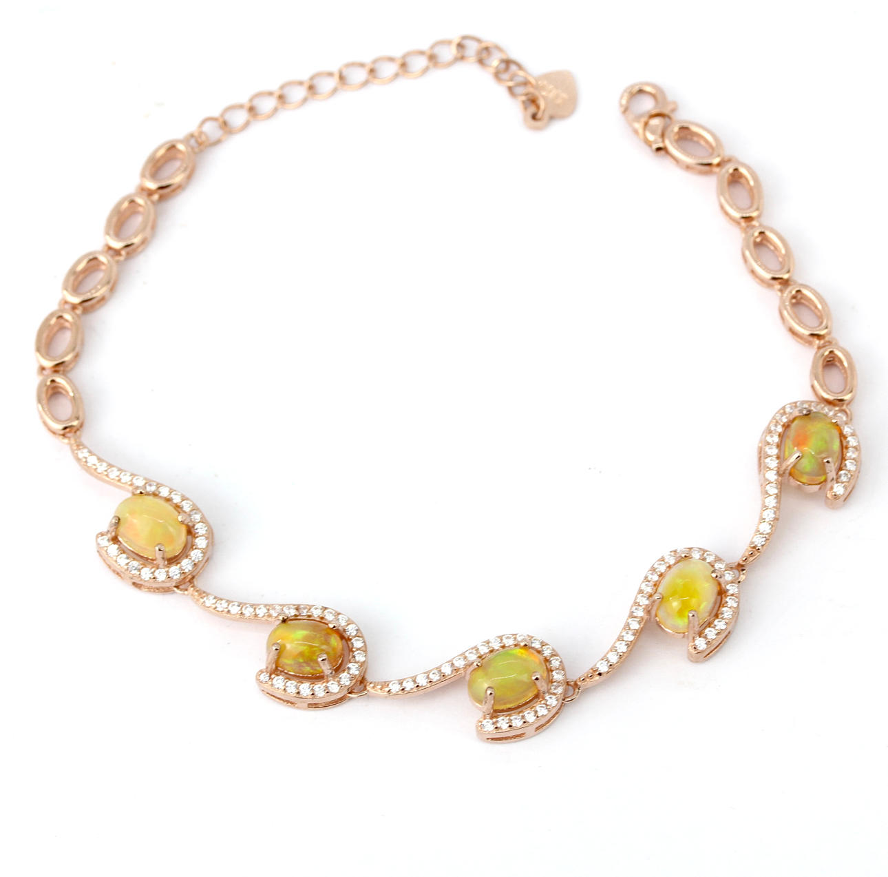 Ett silverrosa förgyllt armband med opaler och andra vita stenar. Längd: 21cm.