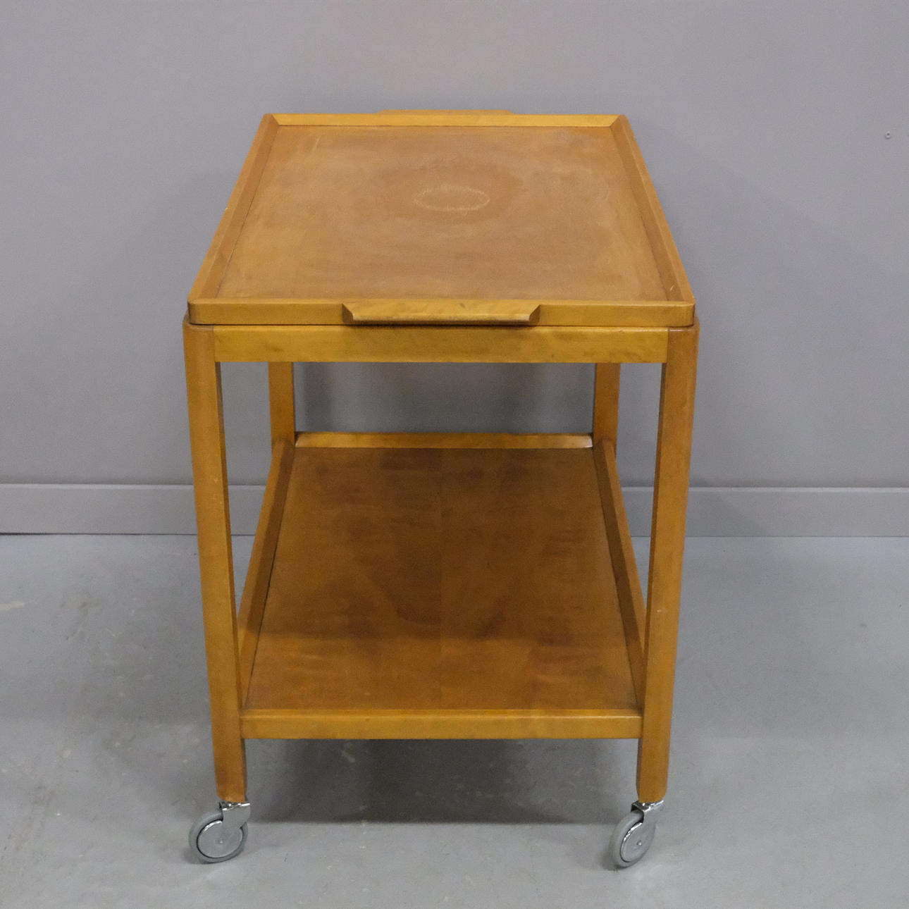 På hjul, löstagbar bricka, hylla, höjd 61cm, längd 69cm, bredd 45cm.