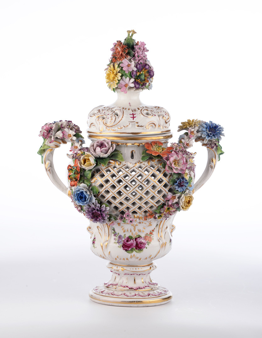421459. AMPHORVAS. Lock med hantering, rik plastblomma trim, perforerad vägg.