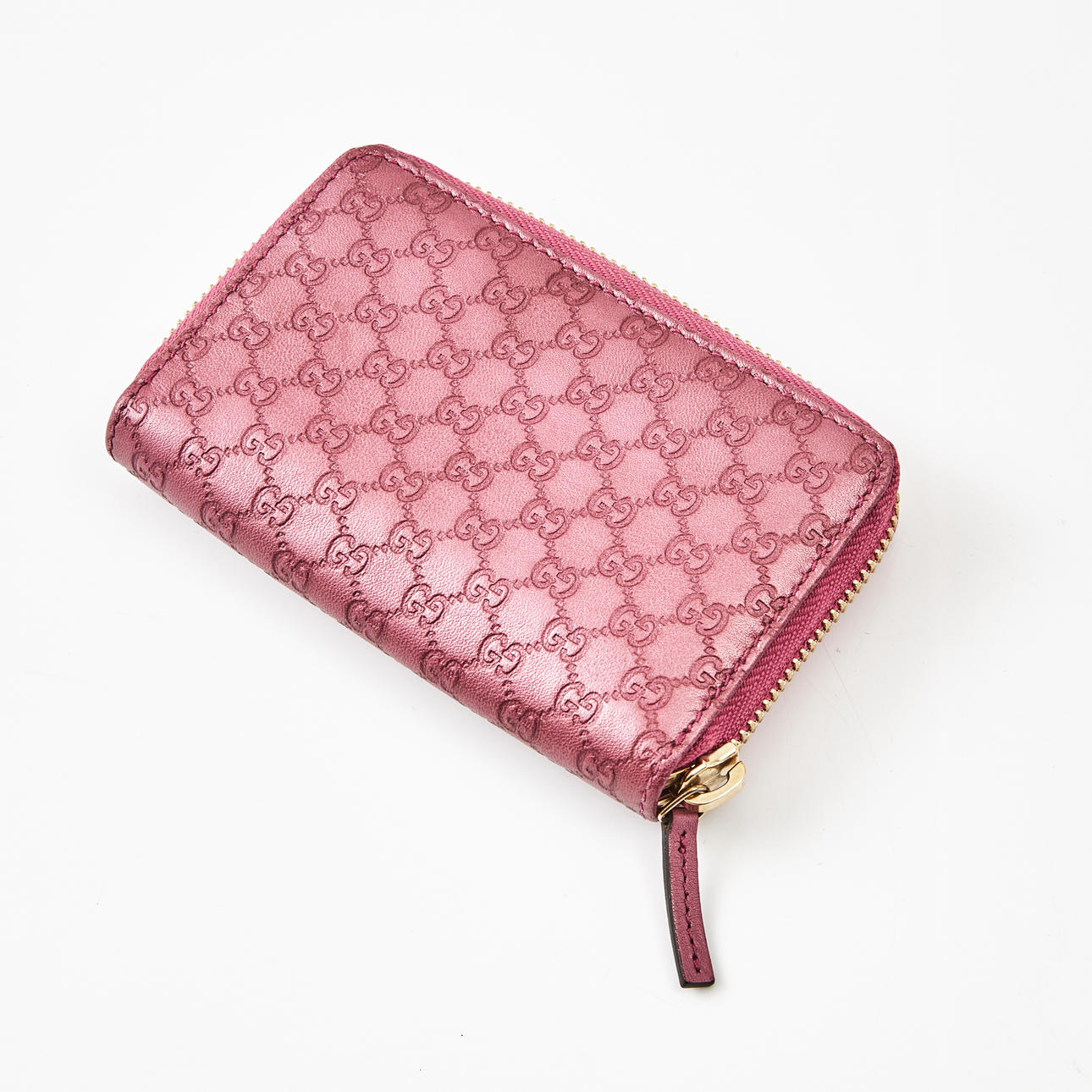 I monogrammönstrad rosa metallicskinn, dragkedja i gulmetall, invändigt i metallicskinn, tre förvaringsområden, märkt "Gucci made in Italy" samt numrerad, mått ca 8x12cm.