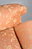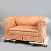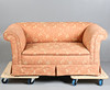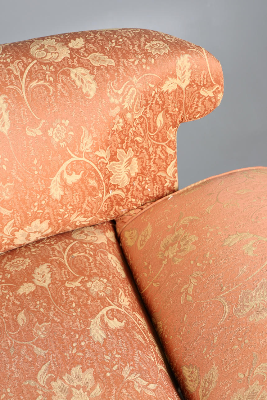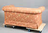 Klädd i rött blommigt tyg, 162cm bred 73cm hög 85cm djup.