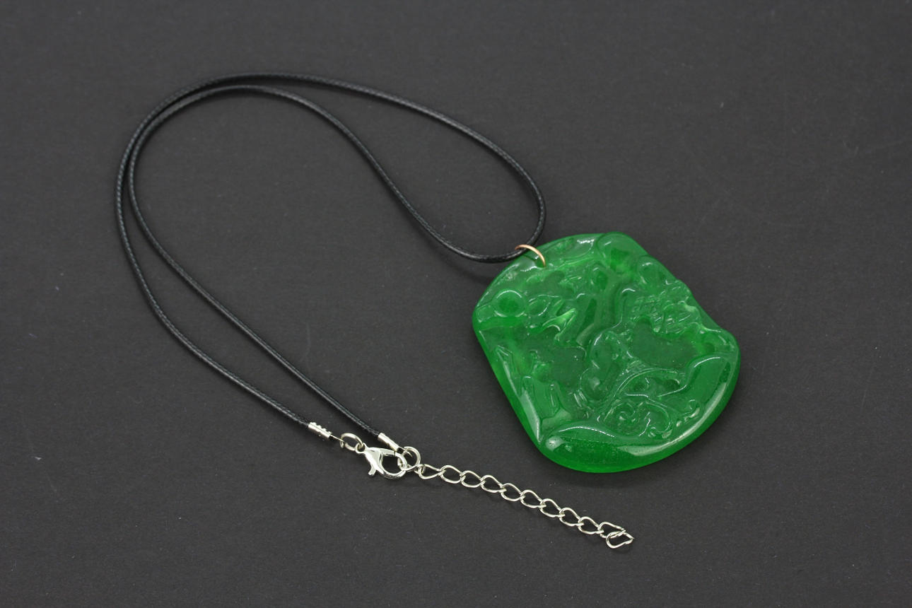 En kinesisk snidad äppelgrön jadeamulett av en bergscen monterad som ett halsband.