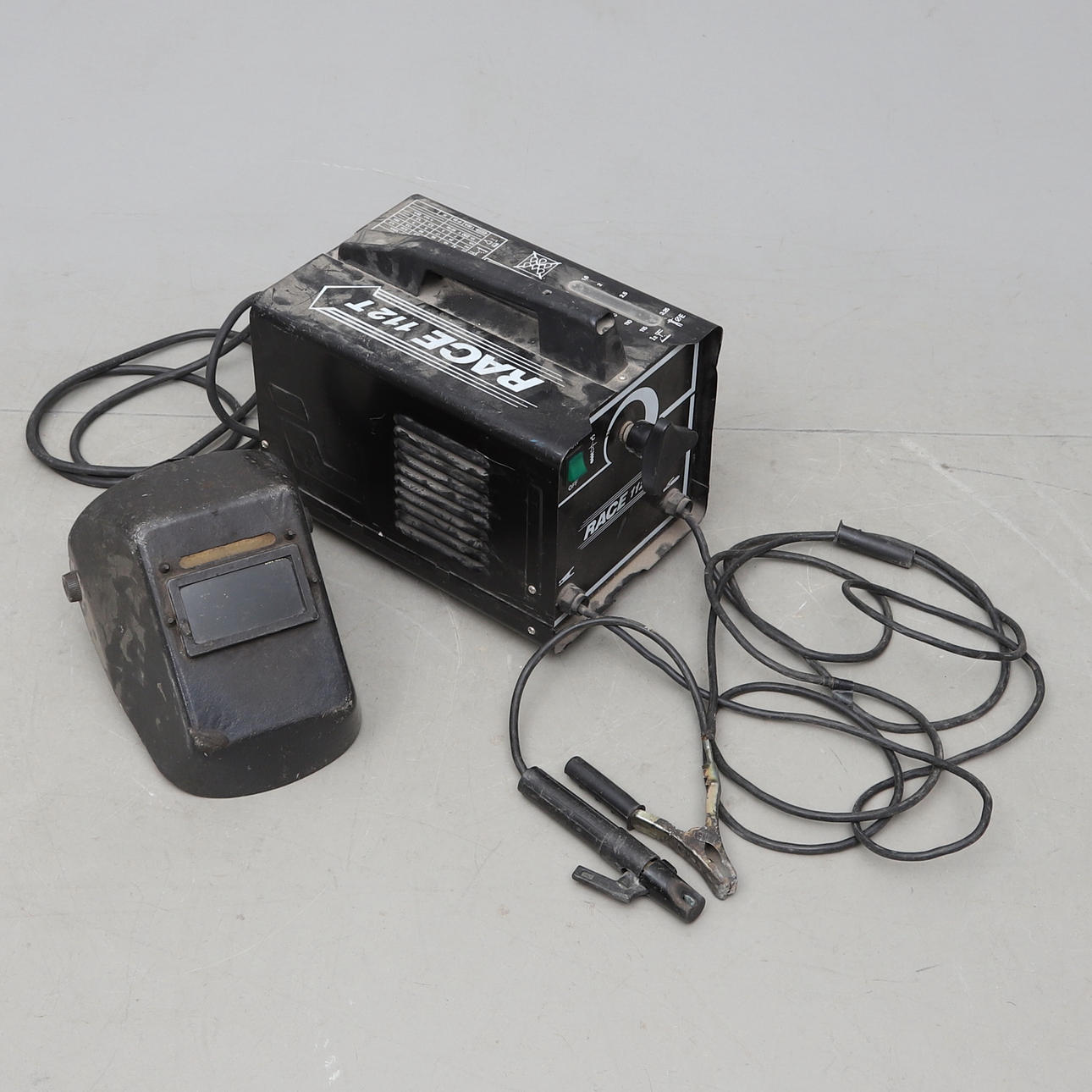 Med svetsskärm.