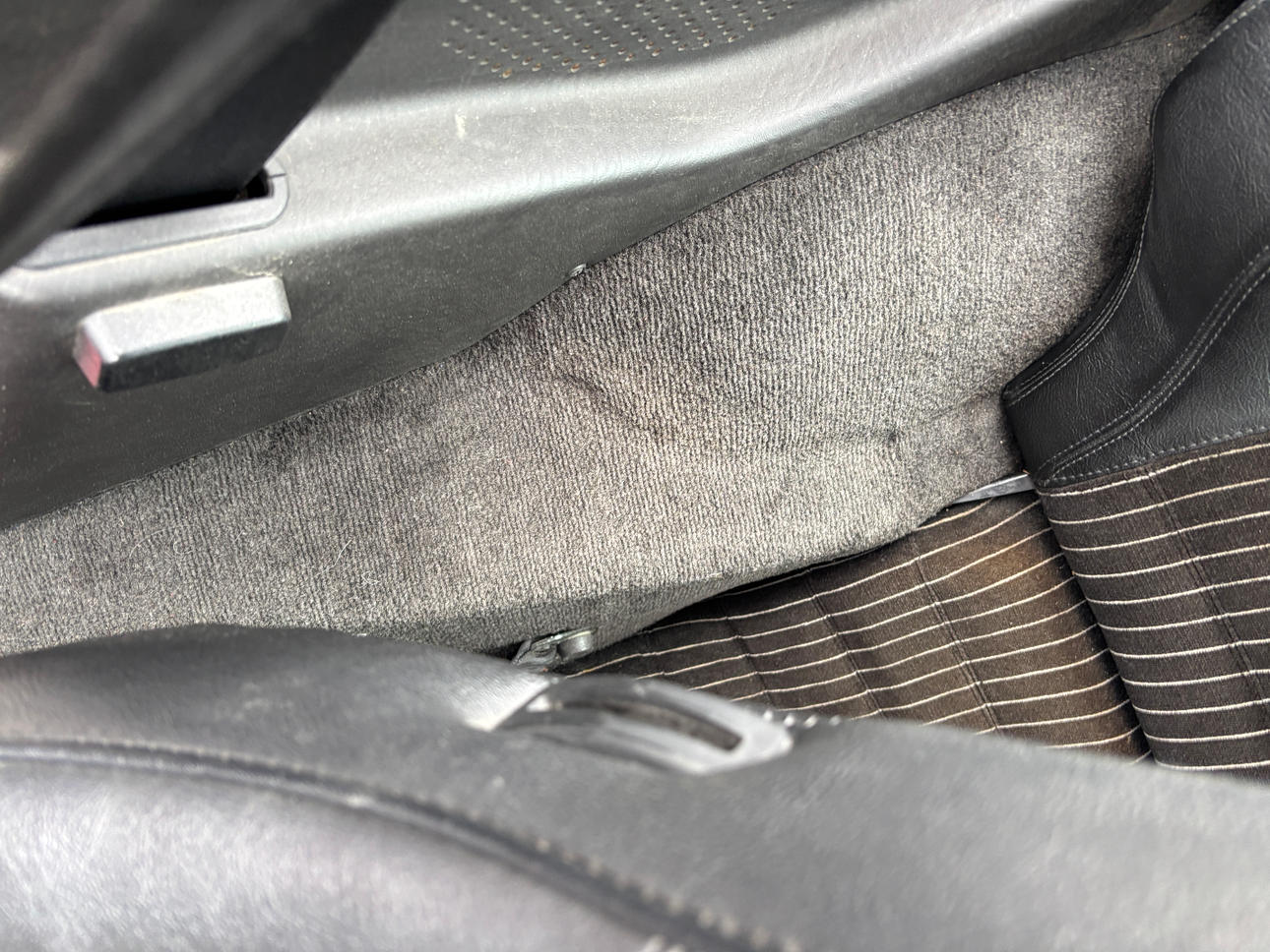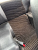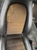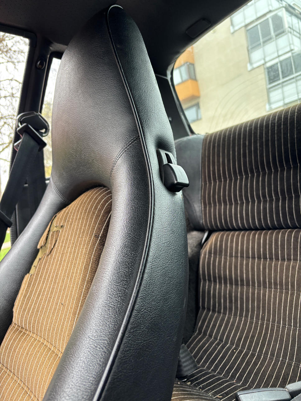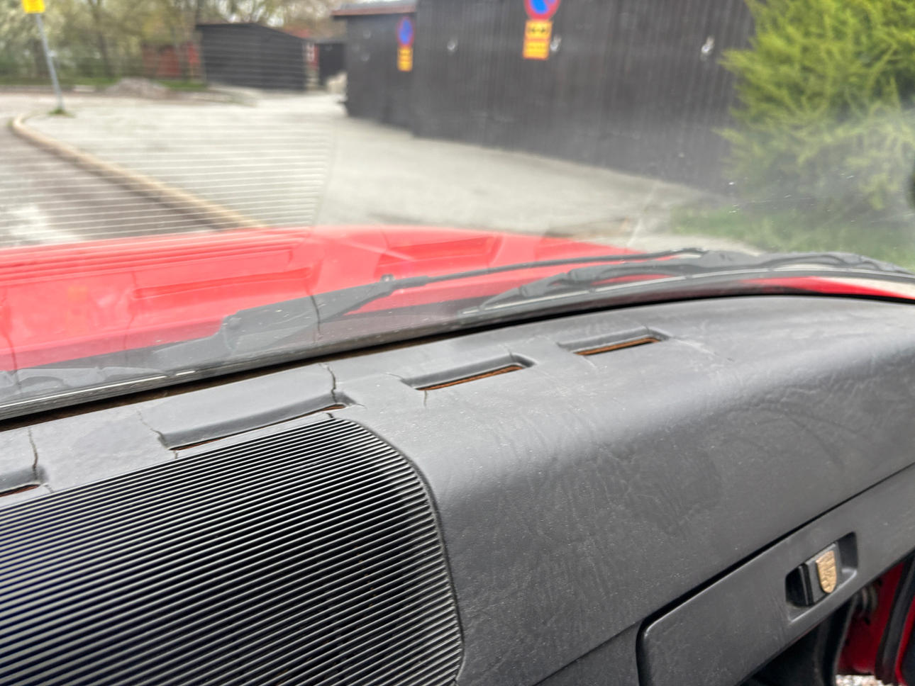 Åldersrelaterat bruksslitage. Sprucken instrumentpanel. Tyg klädsel säte sprucket.