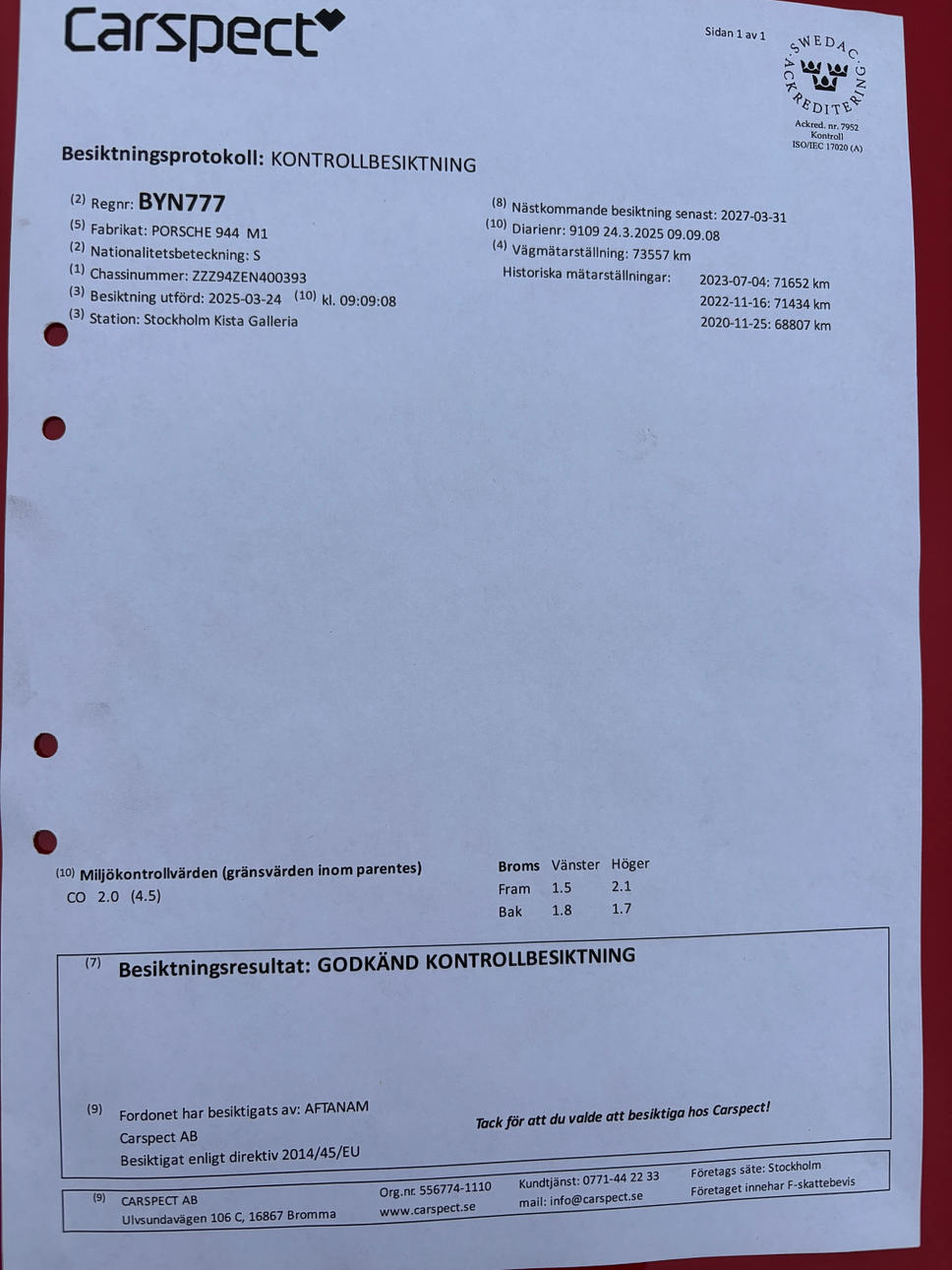Status: I trafik, senast godkända besiktning 20250324