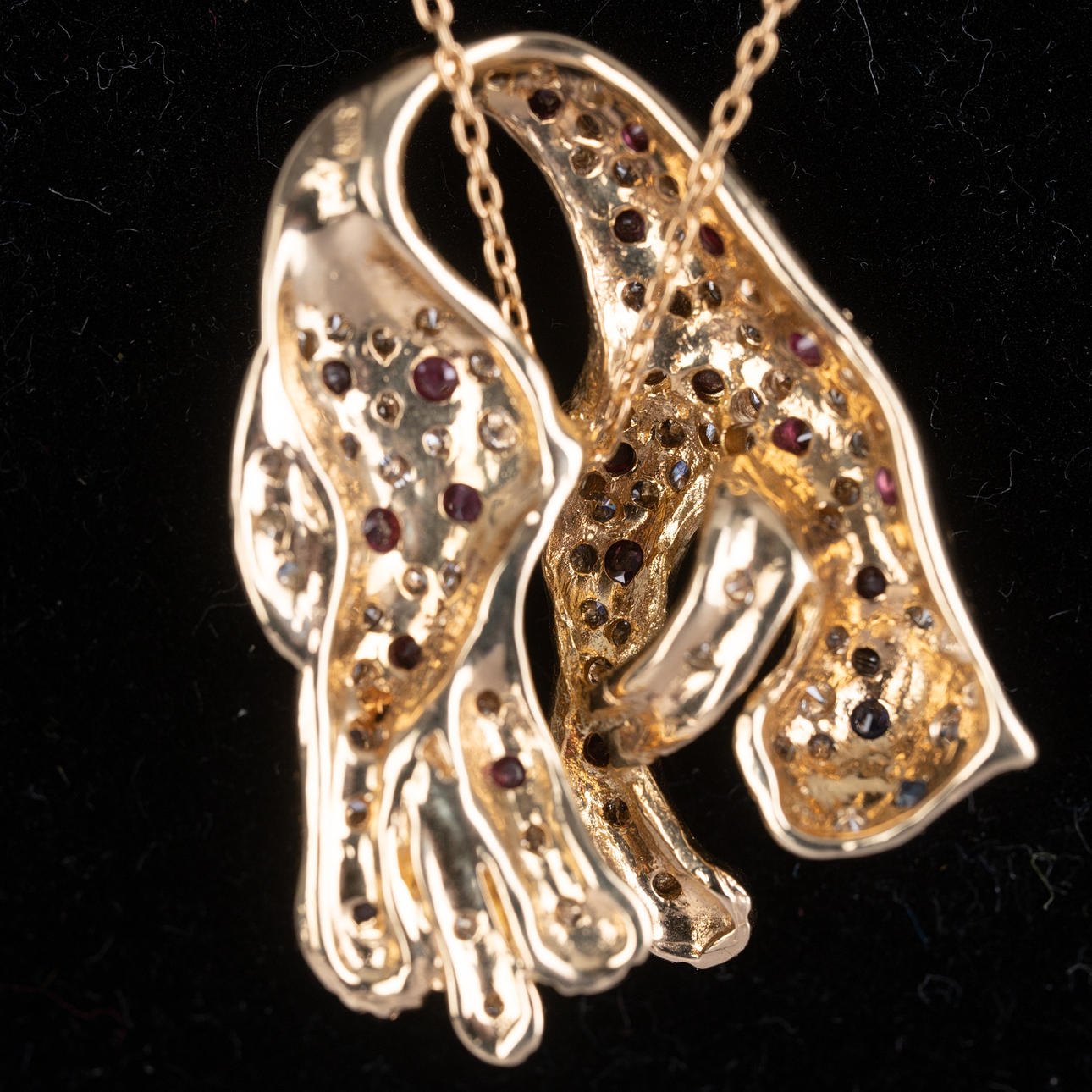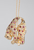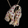 Hänge med kedja, tillverkat av 750 guld, infatterat med rubiner, diamanter och två safirer som öga. Mått ca. Kedjelängd 45 cm, hänge 3 cm. Totalvikt ca. 10, 5 gram.